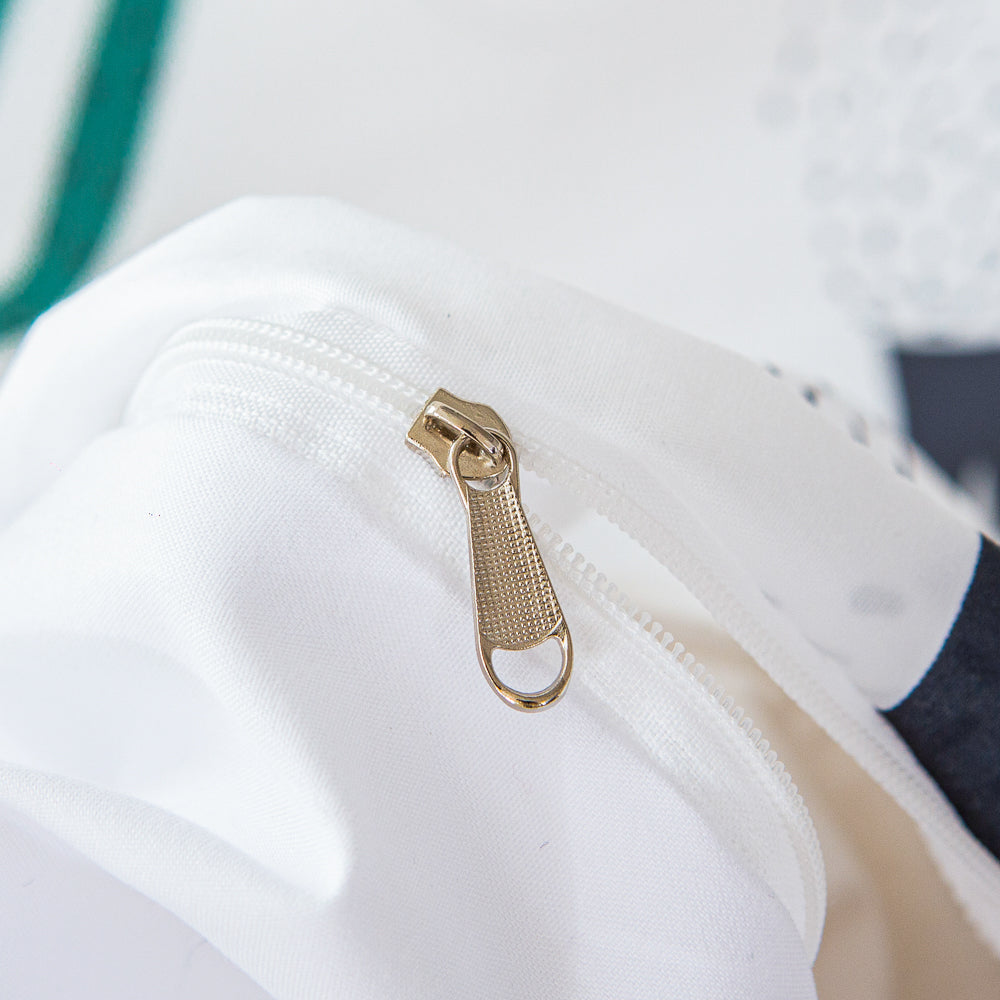 - Duvet cover with ties at the four corners to keep the comforter in place. It also gets a zipper closure.