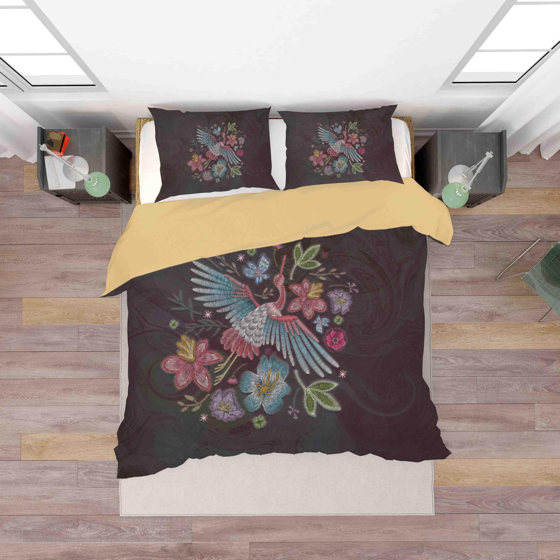 3D Black Embroidery Butterfly Crane Floral Quilt Cover Set Bedding Set Duvet Cover Pillowcases SF009