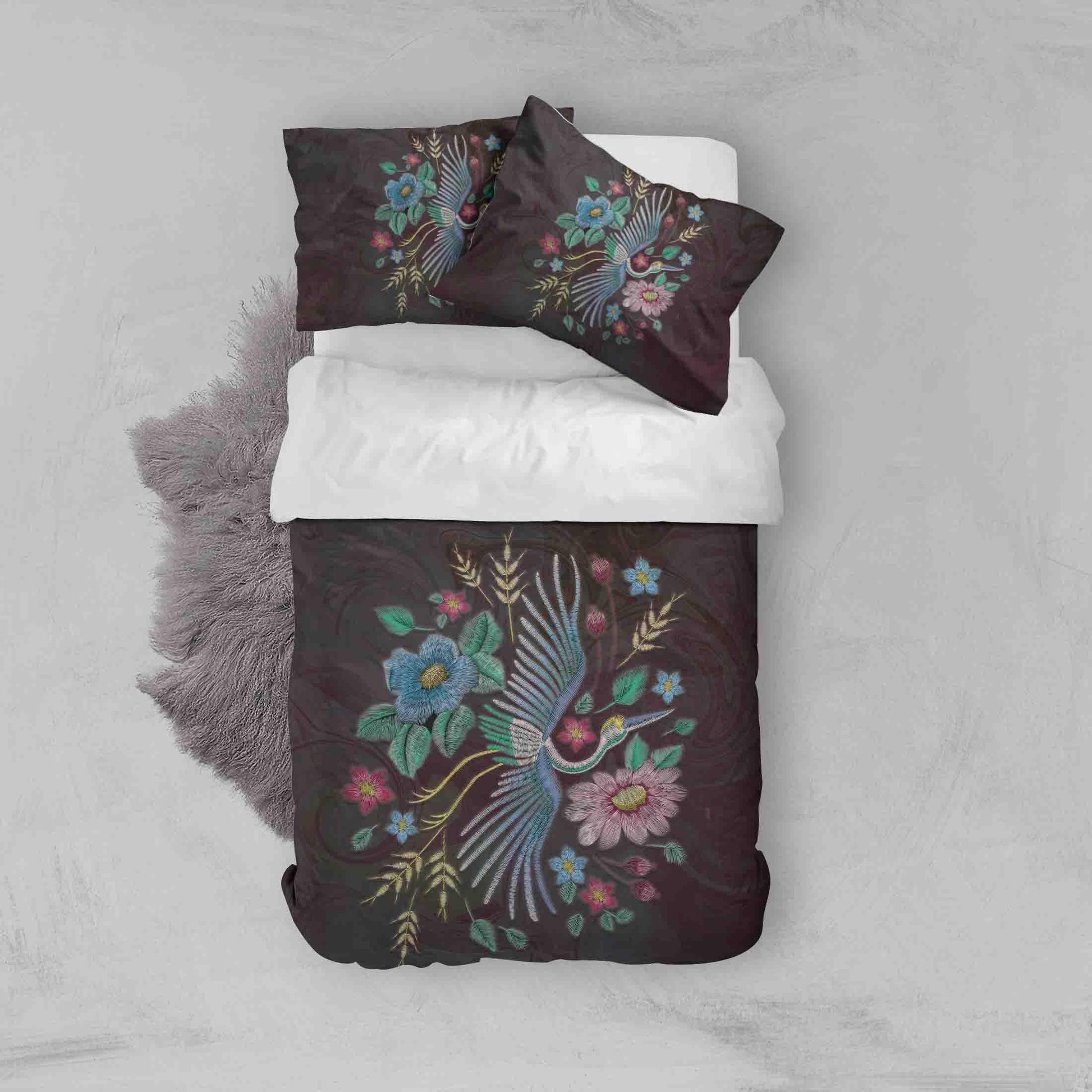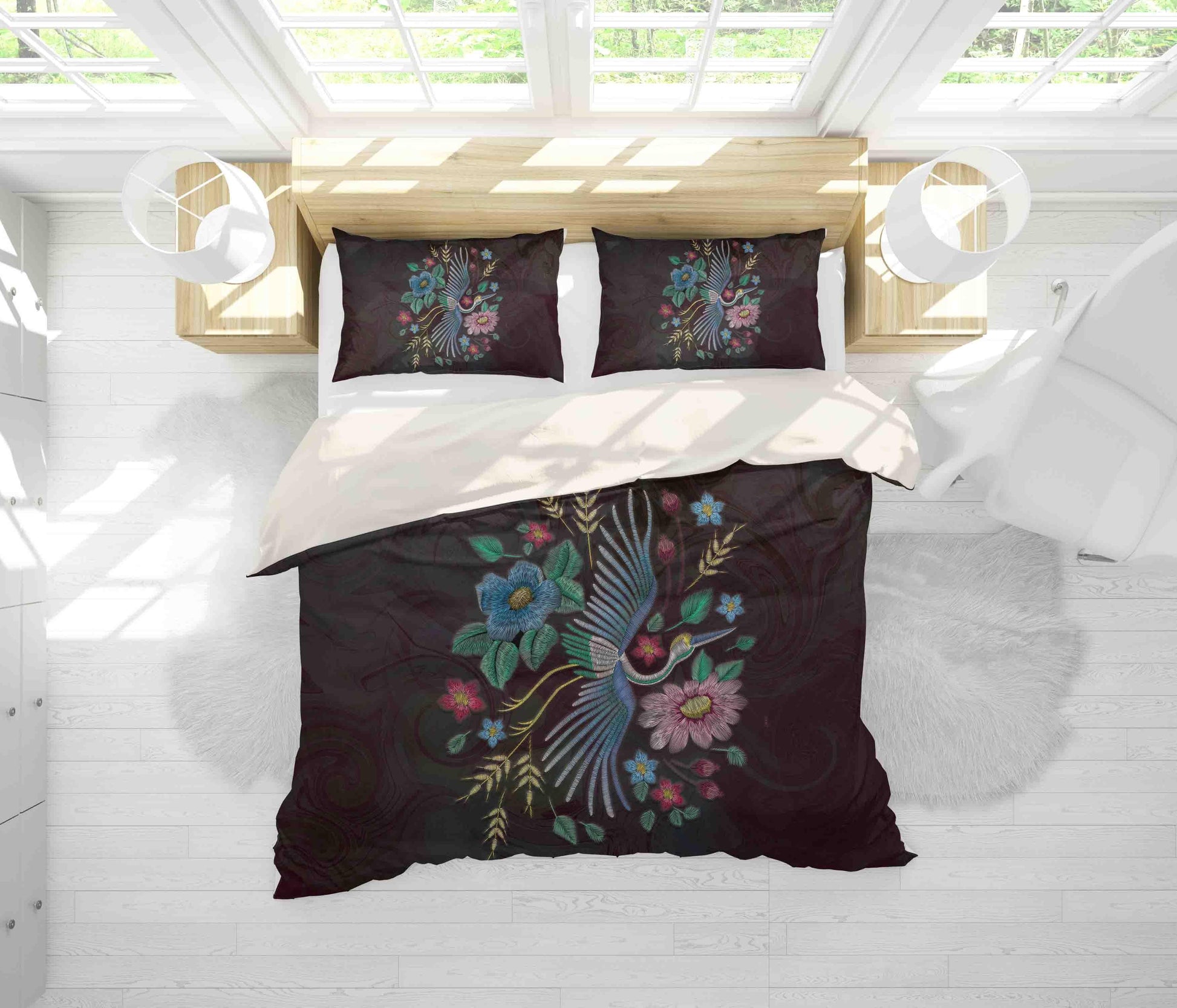 3D Black Embroidery Crane Floral Quilt Cover Set Bedding Set Duvet Cover Pillowcases SF008