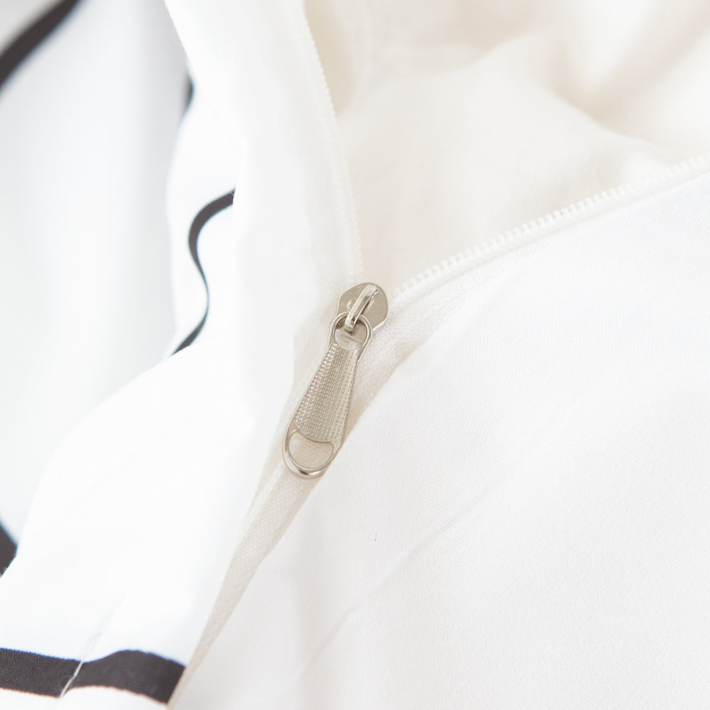 - Duvet cover with ties at the four corners to keep the comforter in place. It also gets a zipper closure.