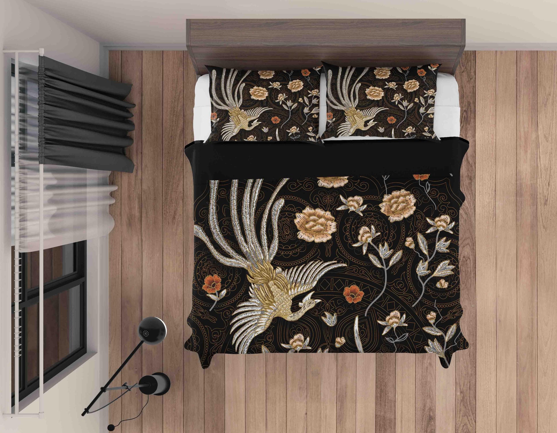 3D Black Phoenix Floral Embroidery Quilt Cover Set Bedding Set Duvet Cover Pillowcases SF006