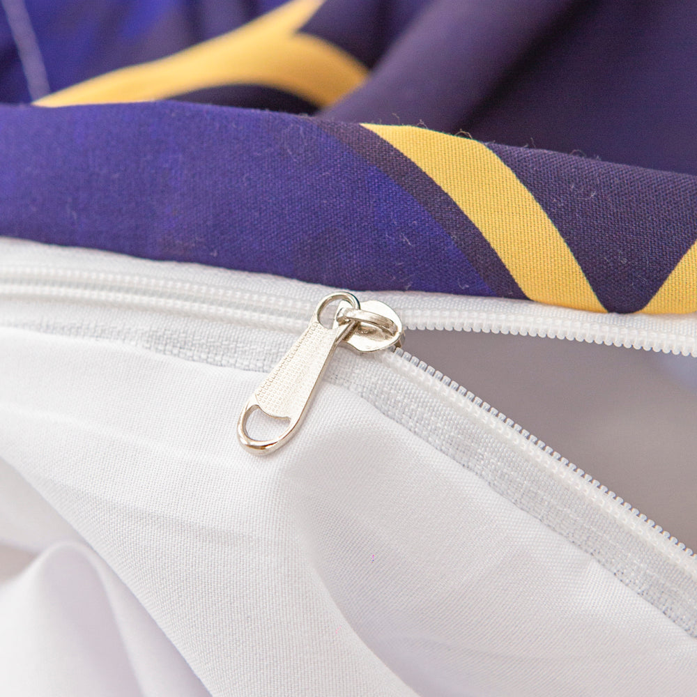 - Duvet cover with ties at the four corners to keep the comforter in place. It also gets a zipper closure.