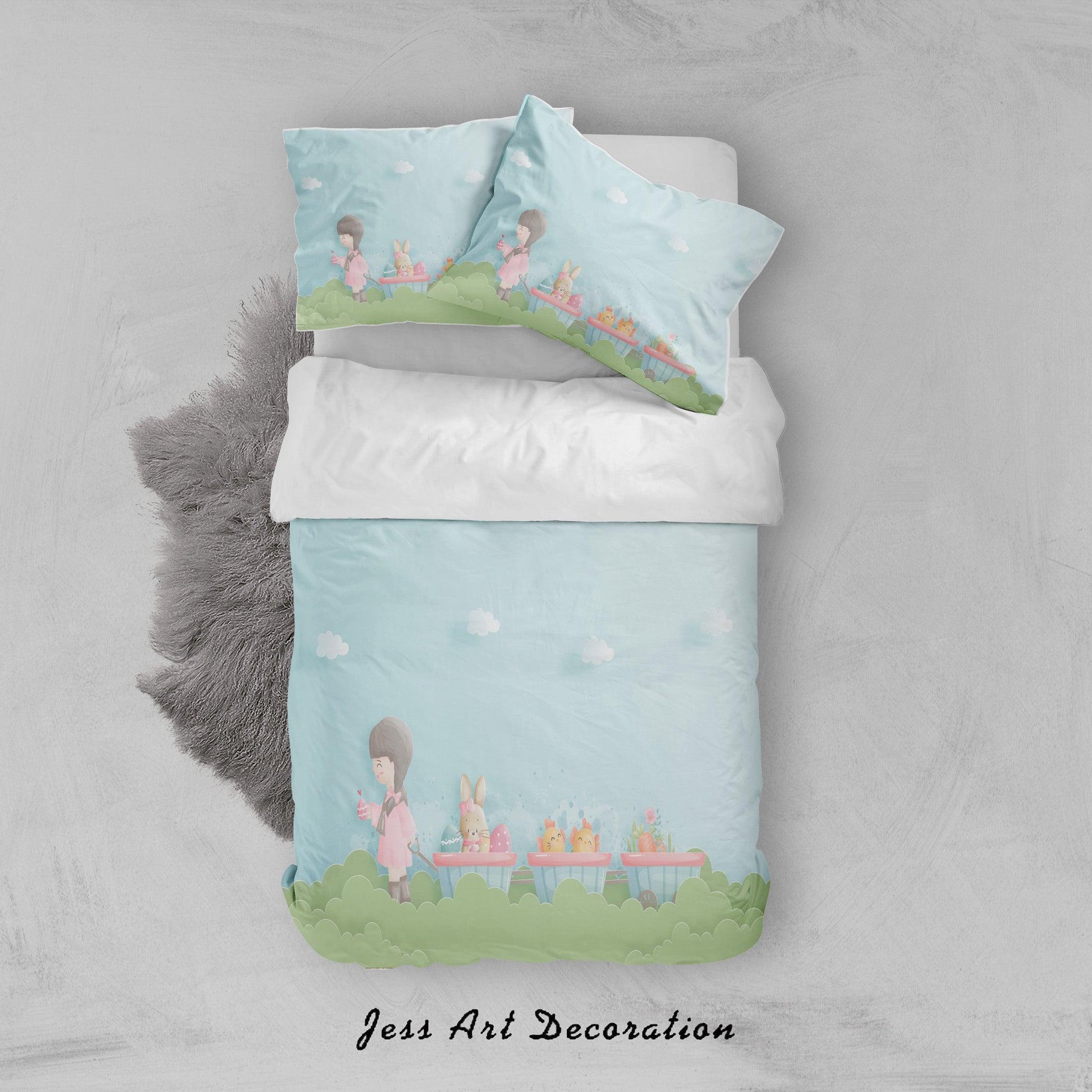 3D Blue Green Cartoon Rabbit Girl Chick Cart Quilt Cover Set Bedding Set Duvet Cover Pillowcases SF80