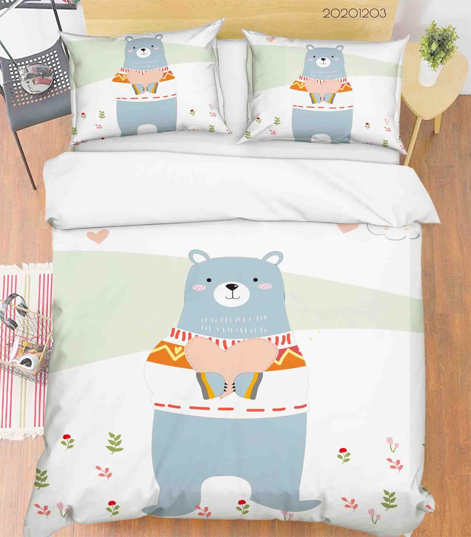 3D Cartoon Hand Drawn Blue Bear Animal Floral Plant Quilt Cover Set Bedding Set Duvet Cover Pillowcases LXL