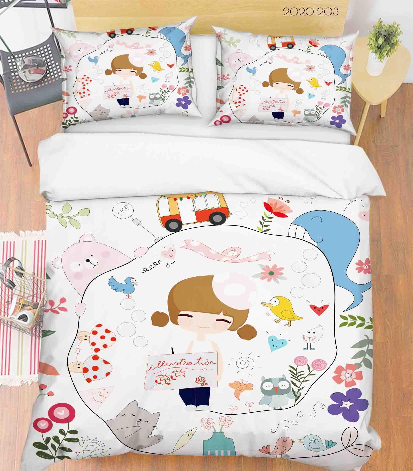 3D Cartoon Hand Drawn Colorful Floral Plant Bear Whale Lovely Girl Quilt Cover Set Bedding Set Duvet Cover Pillowcases LXL