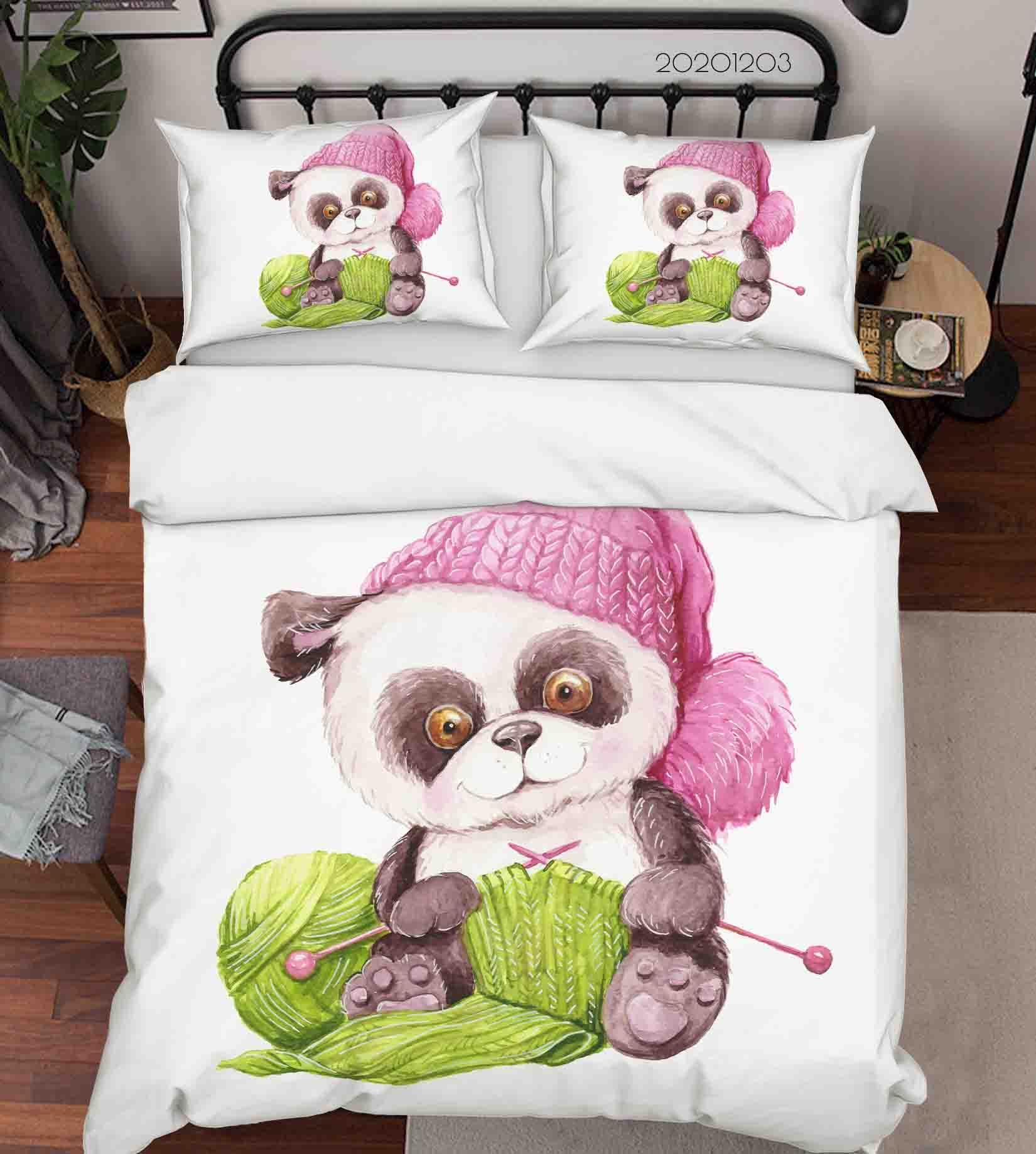 3D Cartoon Hand Drawn Pink Wool Cap Green Knitting Panda Animal Quilt Cover Set Bedding Set Duvet Cover Pillowcases LXL