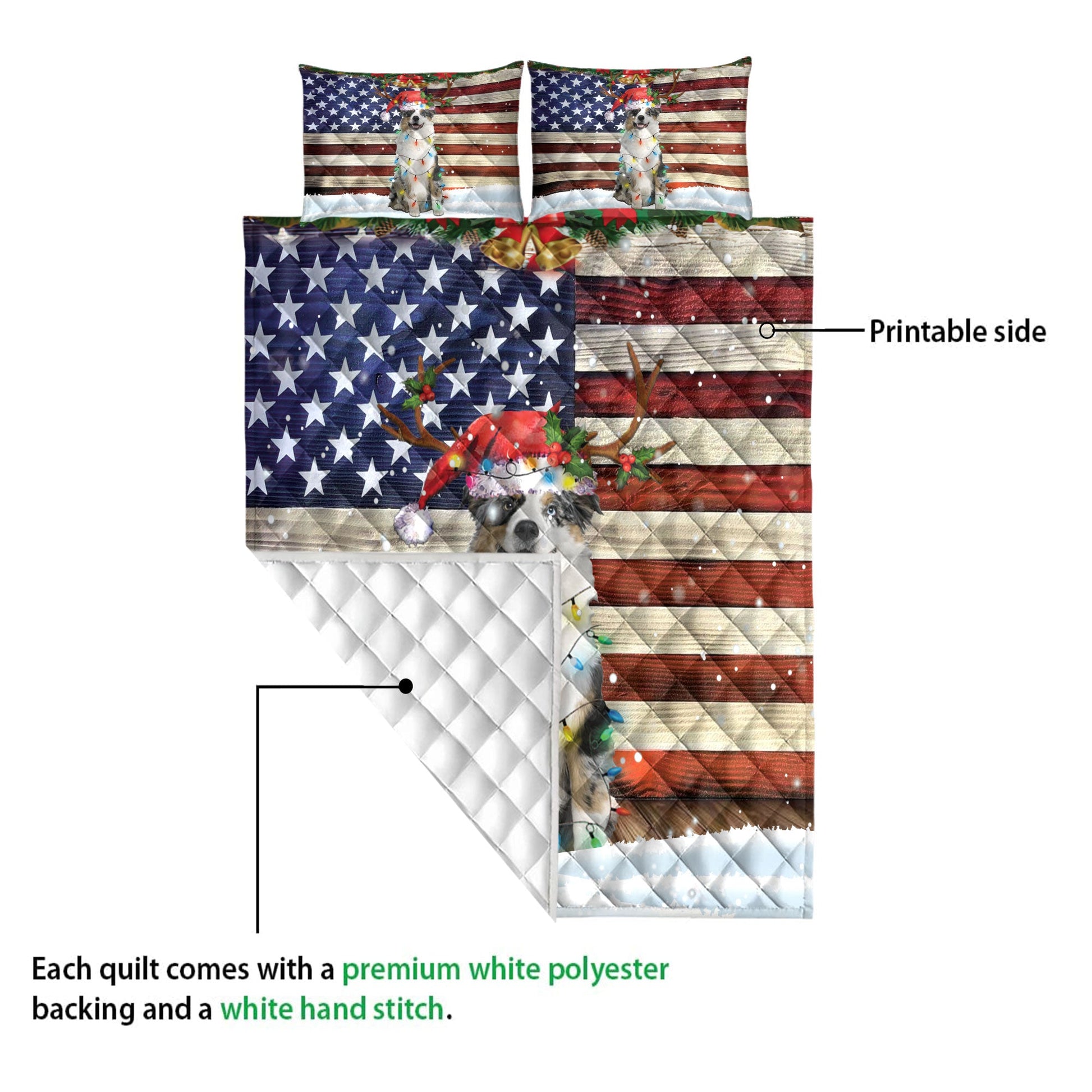 Australian Shepherd Quilt Set, A Ustralian Shepherd Wearing A Red Reindeer Hat With String Light Quilt Blanket With Pillowcases, Quilt Bedding Set