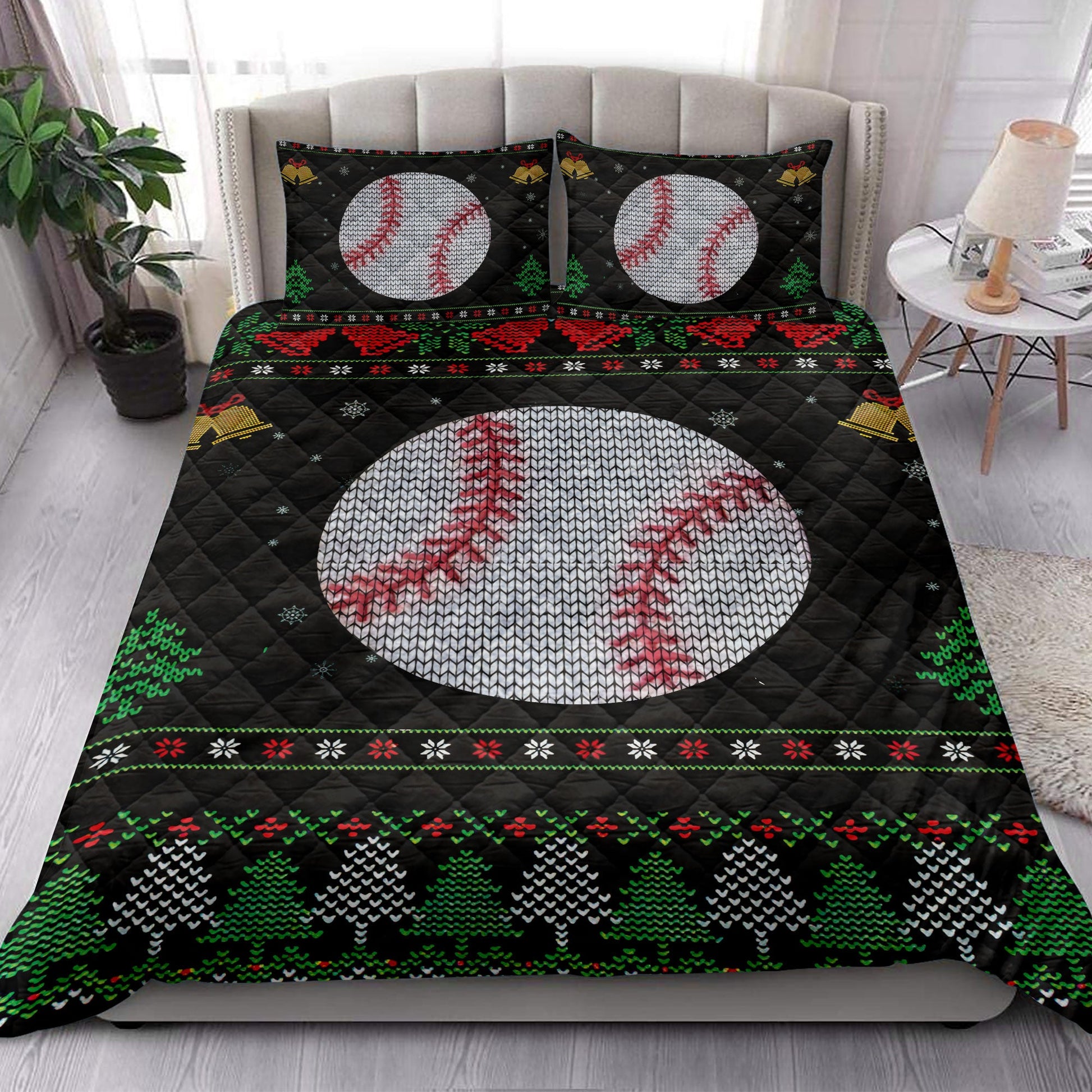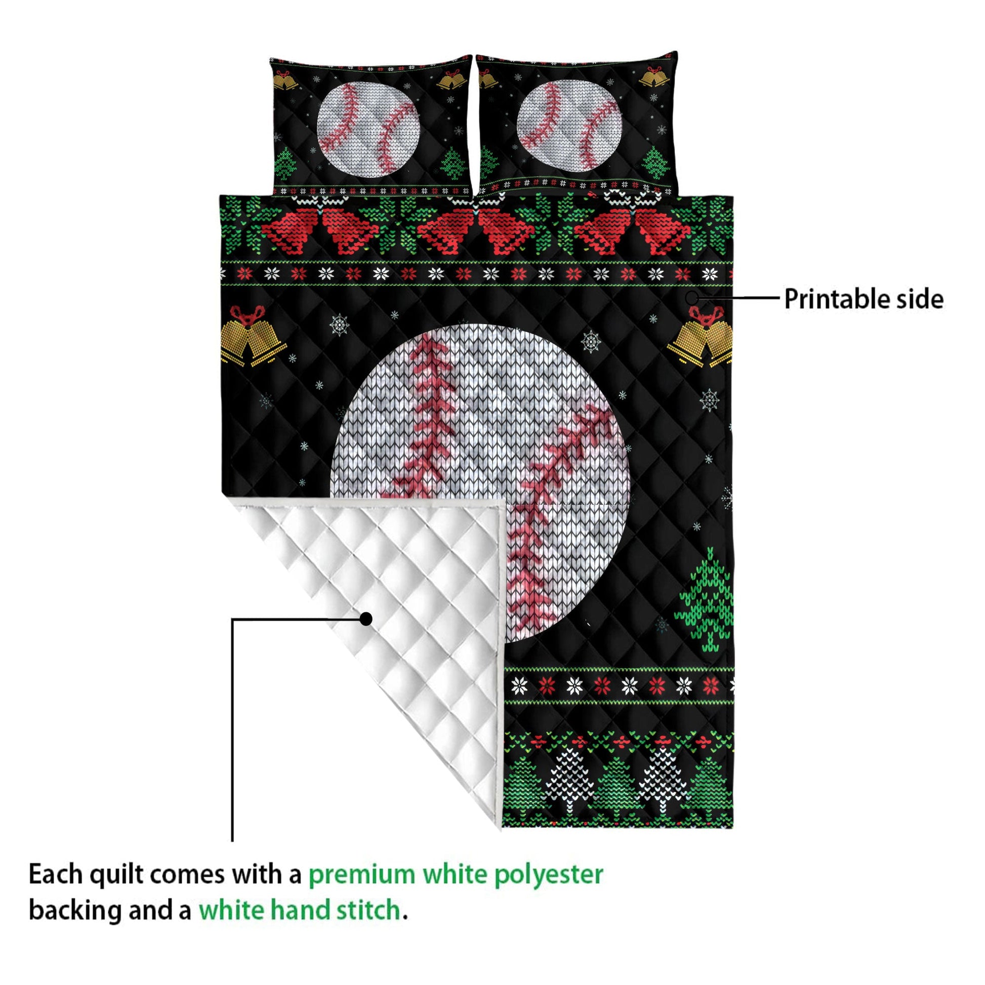 Baseball Quilt Set, Baseball Snowflake Bell Ugly Chrismas Quilt Blanket With Pillowcases, Quilt Bedding Set, Sports Gifts