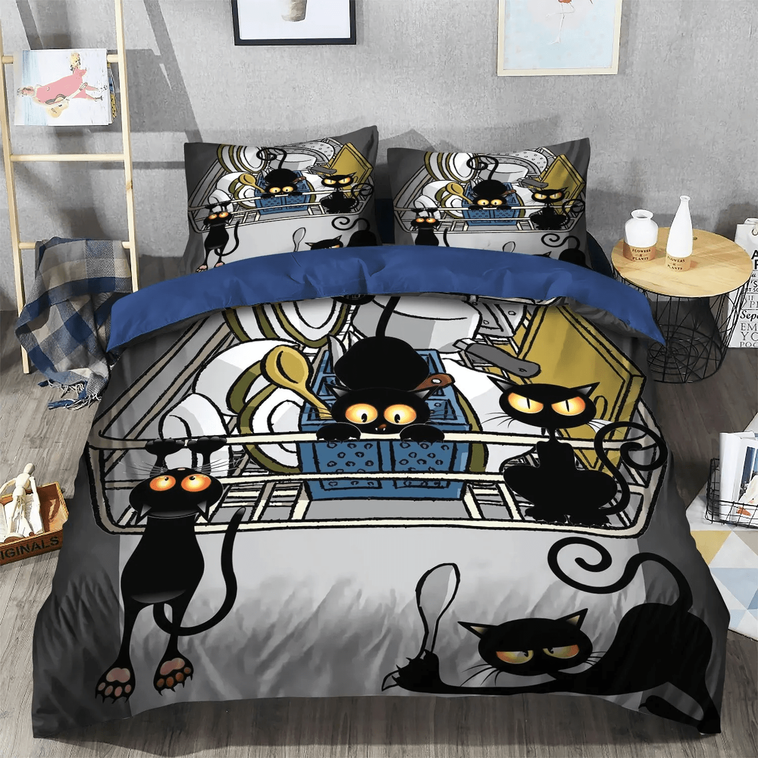 Black Cat Foals Soft Duvet Cover Set, Black Cat Bedding set, Black Cat Dishes Bedding Set, Gifts for Black Cat