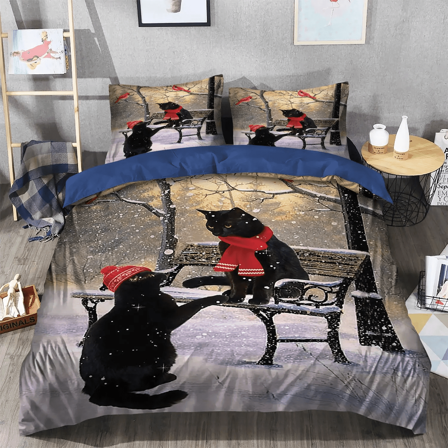 Black Cat Nsn Transparent Bedding set, Winter Sports Soft Duvet Cover Set, Black Cat Hello Winter Bedding Set, Gifts for Winter