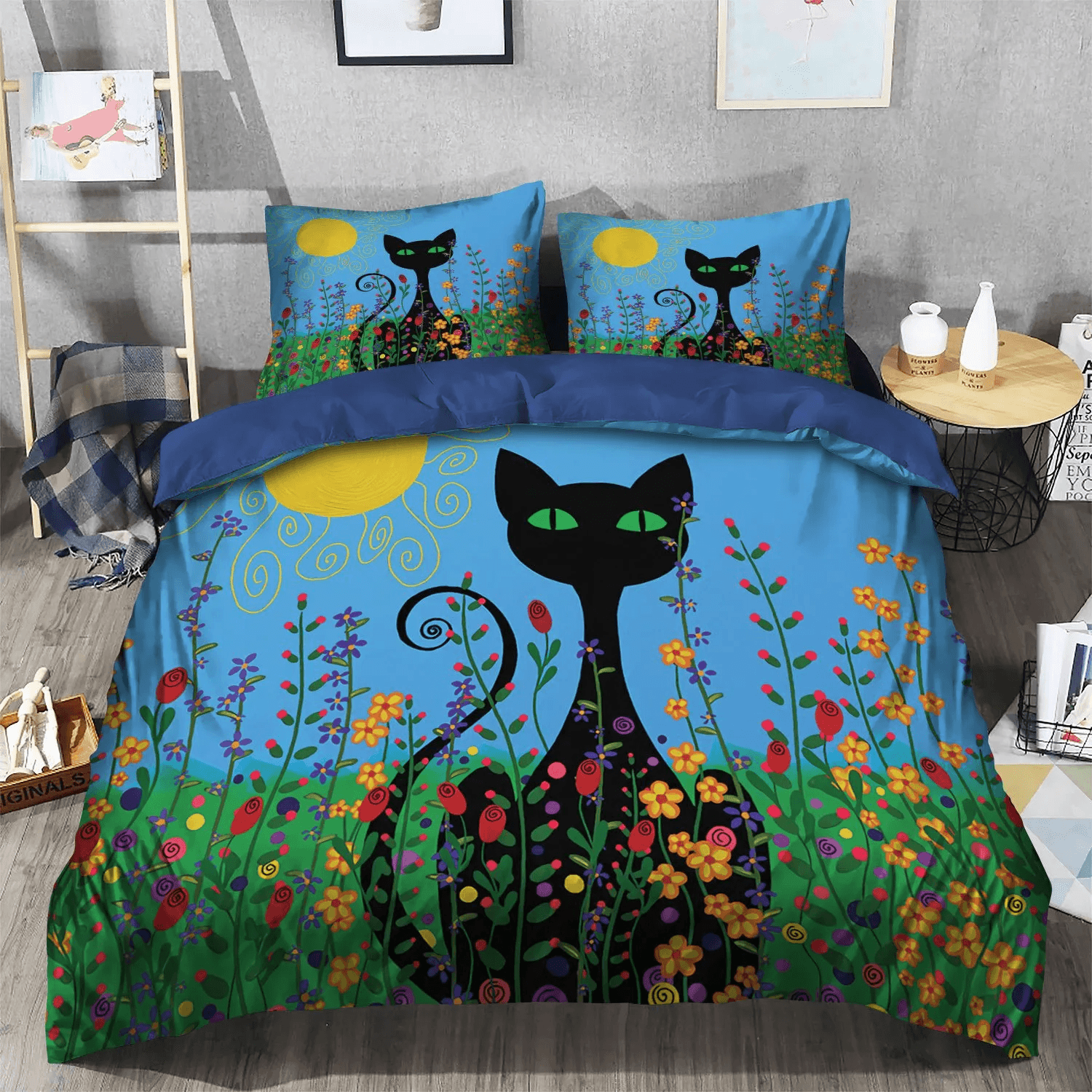 Black Cat Soft Duvet Cover Set, Black Cat Nsn Transparent King Size Bedding Set, Black Cat In Flowers Bedding Set, Gifts for Flower