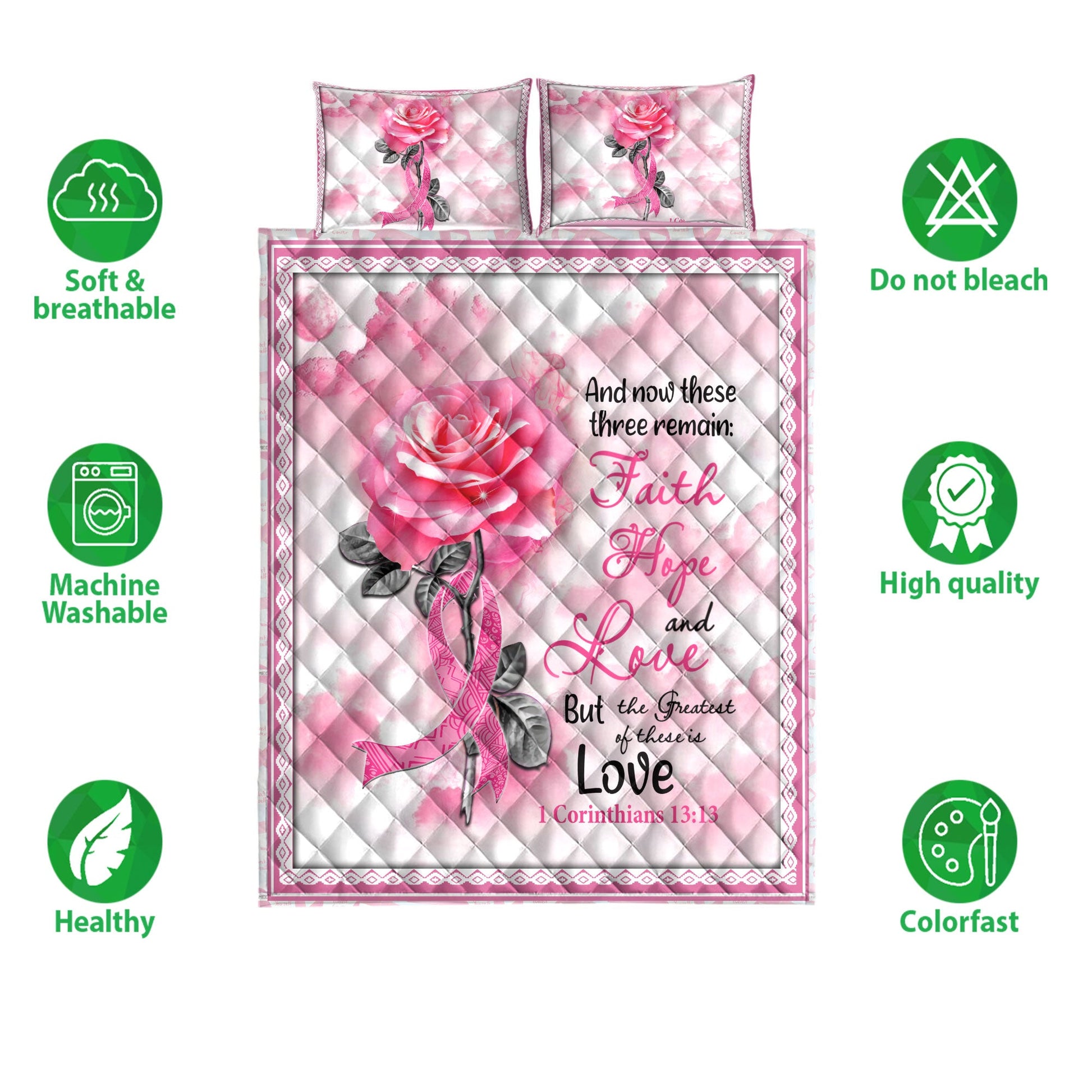 Breast Cancer Quilt Set, Breast Cancer Awareness Pink Bc Support Rose Faith Hope Love Quilt Blanket With Pillowcases, Quilt Bedding Set