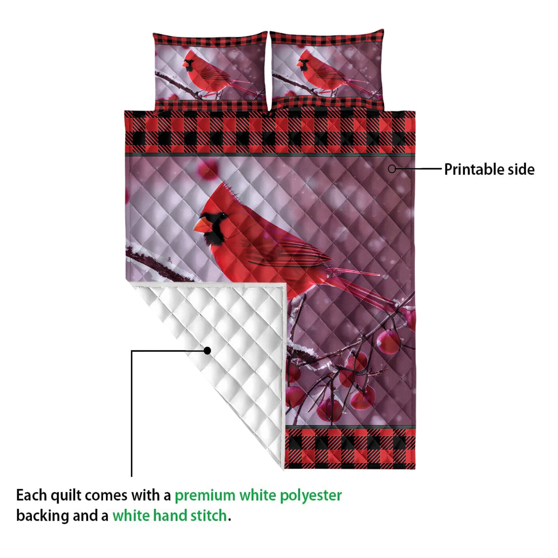 Cardinal Quilt Set, Red Cardinal Cherry Tree Snowflake Red Buffalo Plaid Bird Quilt Blanket With Pillowcases, Quilt Bedding Set