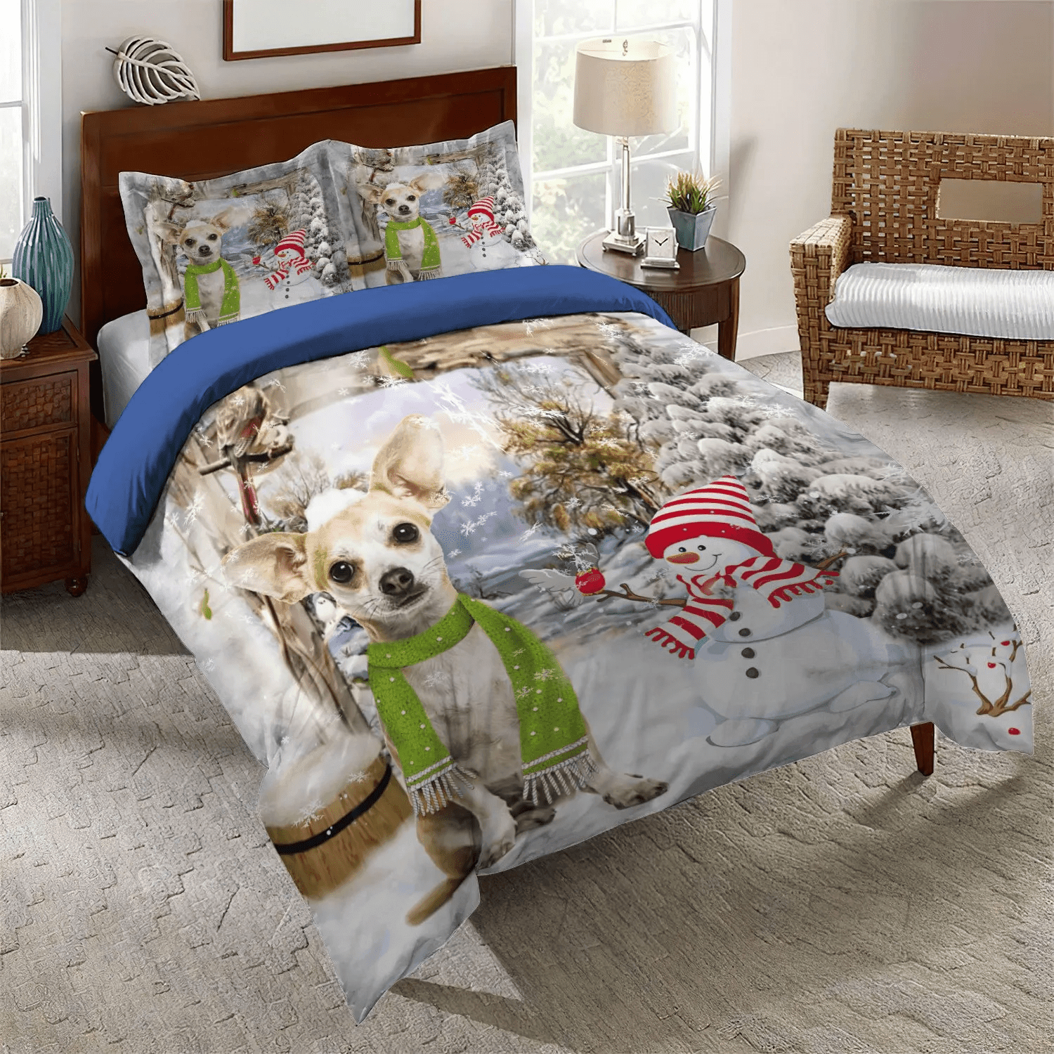 Chihuahua Dog Lover Queen Size Bedding Set, Chihuahua Owner Soft Duvet Cover Set, Chihuahua And Snowman Bedding Set, Gifts for Snowman