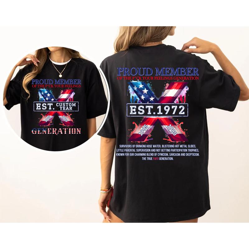 Est.Custom Year Proud Member FAFO Gen X 2 Side T-shirt, 1965-1980 Hose Water Gen X Shirt, Proud Member FAFO Flag Generation Shirt