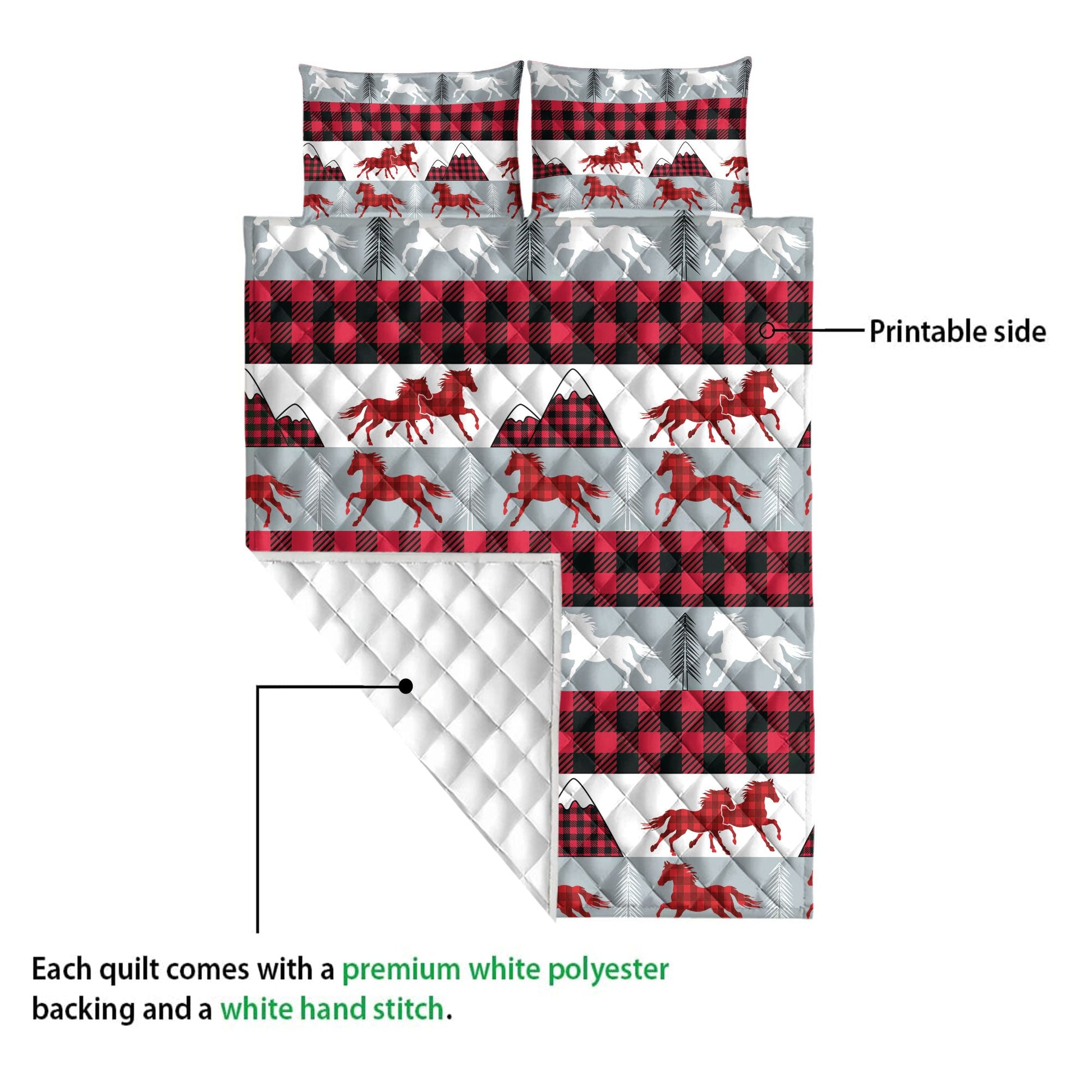 Horse Quilt Set, Christmas Horse Red Buffalo Plaid Winter Holiday Quilt Blanket With Pillowcases, Quilt Bedding Set, Christmas Gift