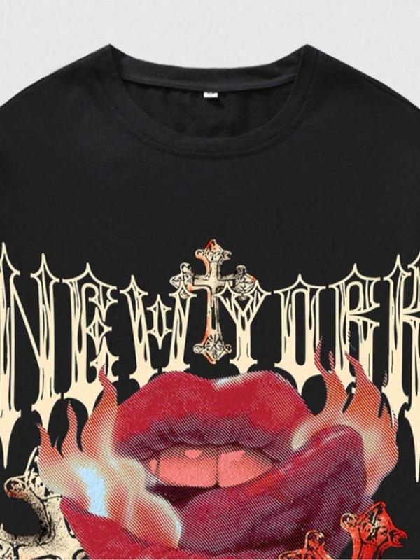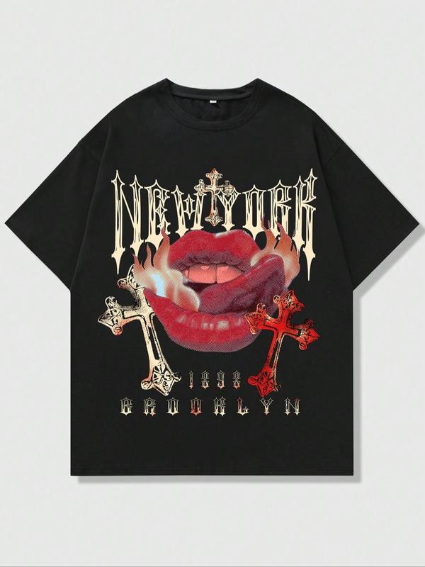 Men's Regular Fit Cross Graphic Round Neck Tee, Lips & Letter Print Short Sleeve T-shirt for Daily Wear, Fashion Casual Men's Clothes for All Seasons