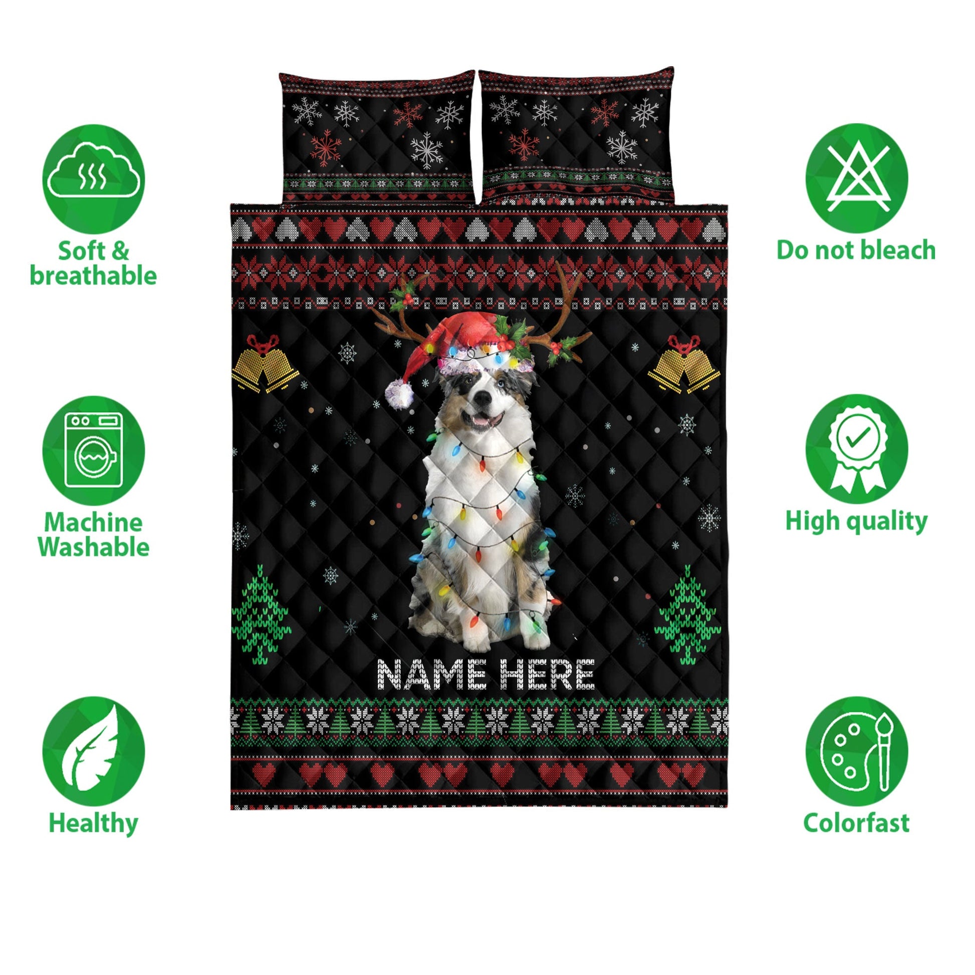 Personalized Australian Shepherd Quilt Set, A Ustralian Shepherdmas Hat Quilt Blanket With Pillowcases, Custom Name Quilt Bedding Set, Christmas Gift