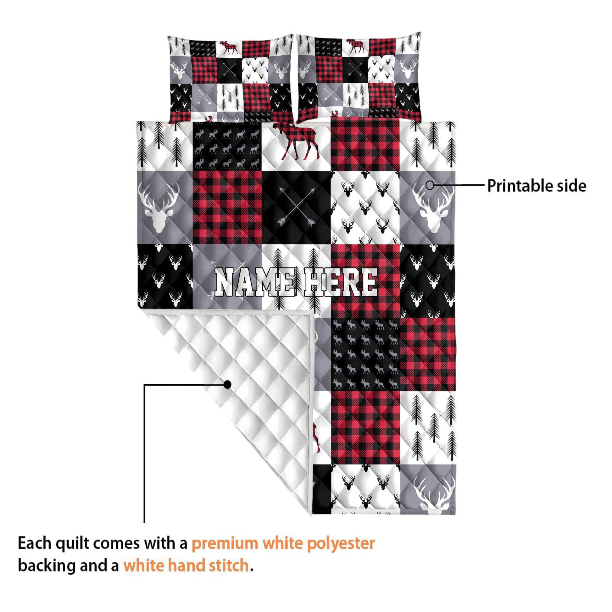 Personalized Christmas Deer Quilt Set, Red Buffalo Plaid Quilt Blanket & Pillowcases, Elk Quilt Bedding Set, Xmas Bedspread, Custom Gifts
