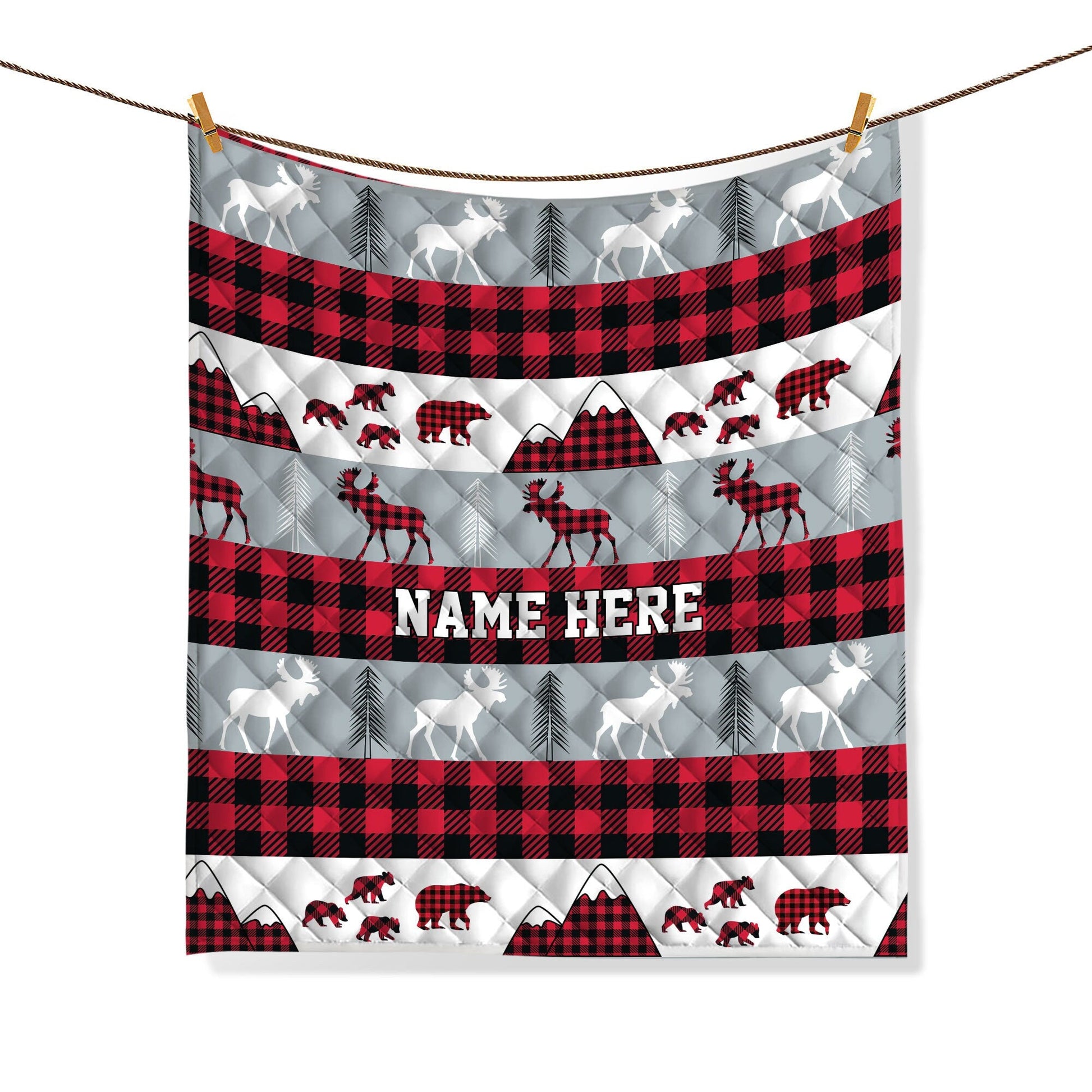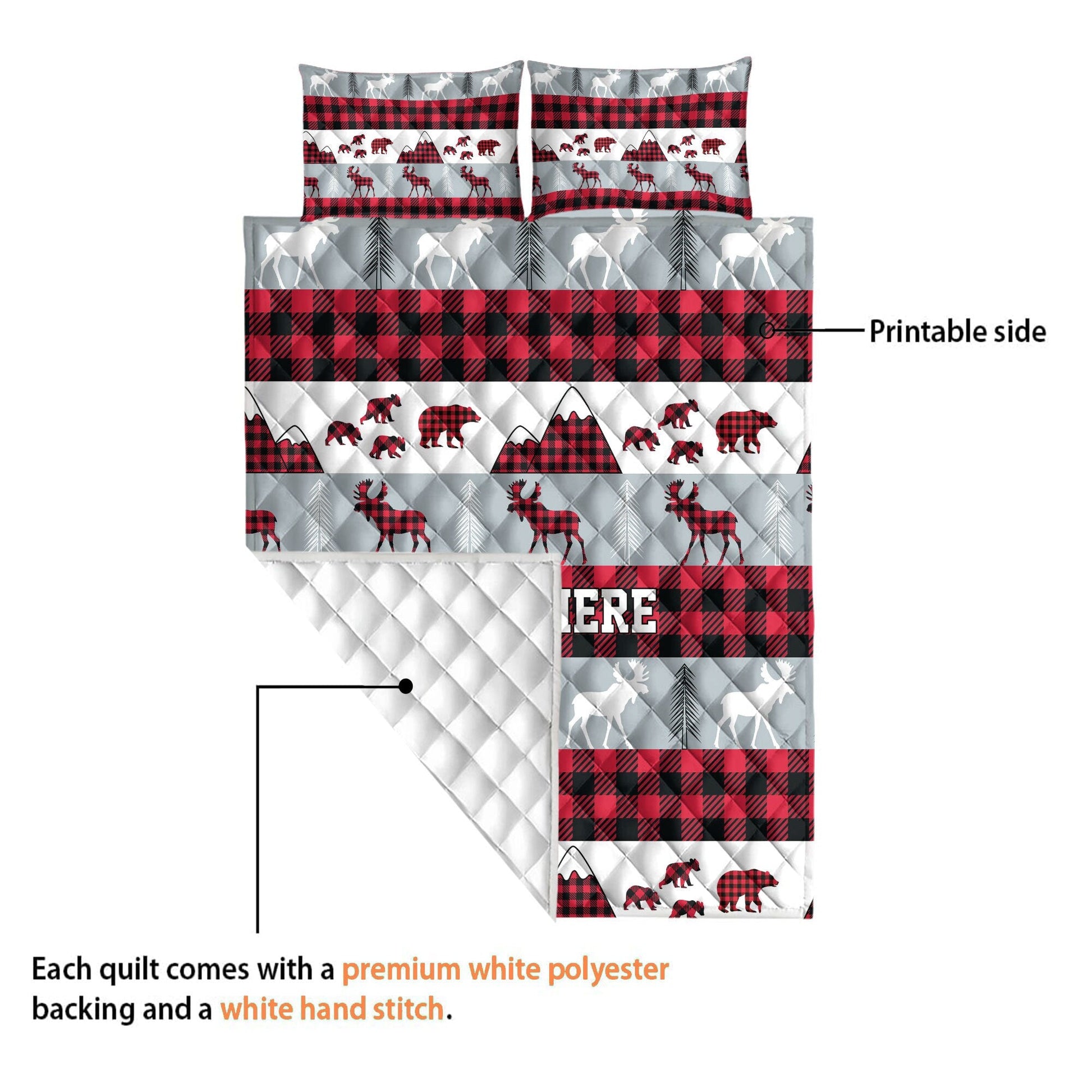 Personalized Christmas Quilt Set, Custom Red Buffalo Plaid Quilt Blanket & Pillowcases, Rustic Moose Bear Quilt Bedding Set, Christmas Gift