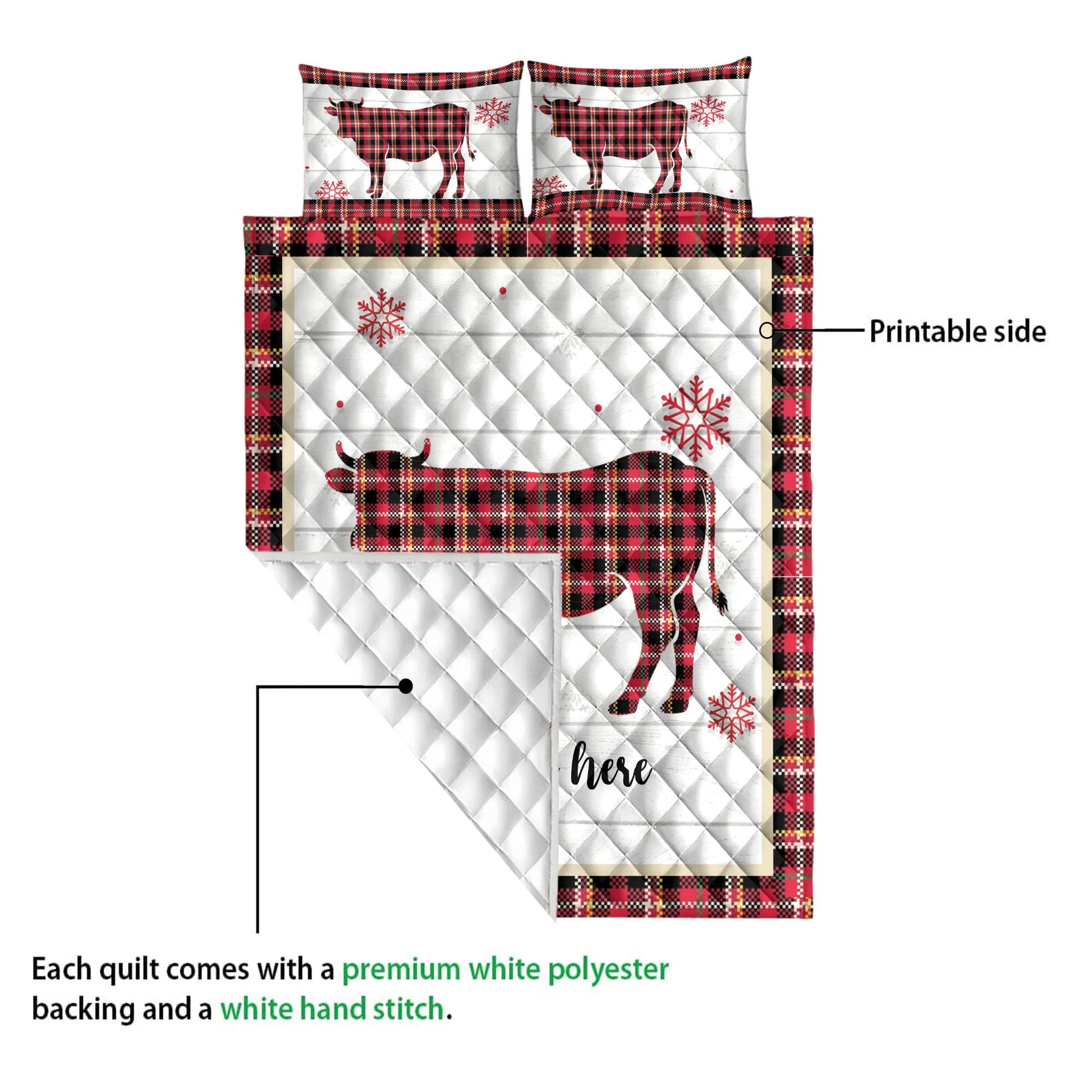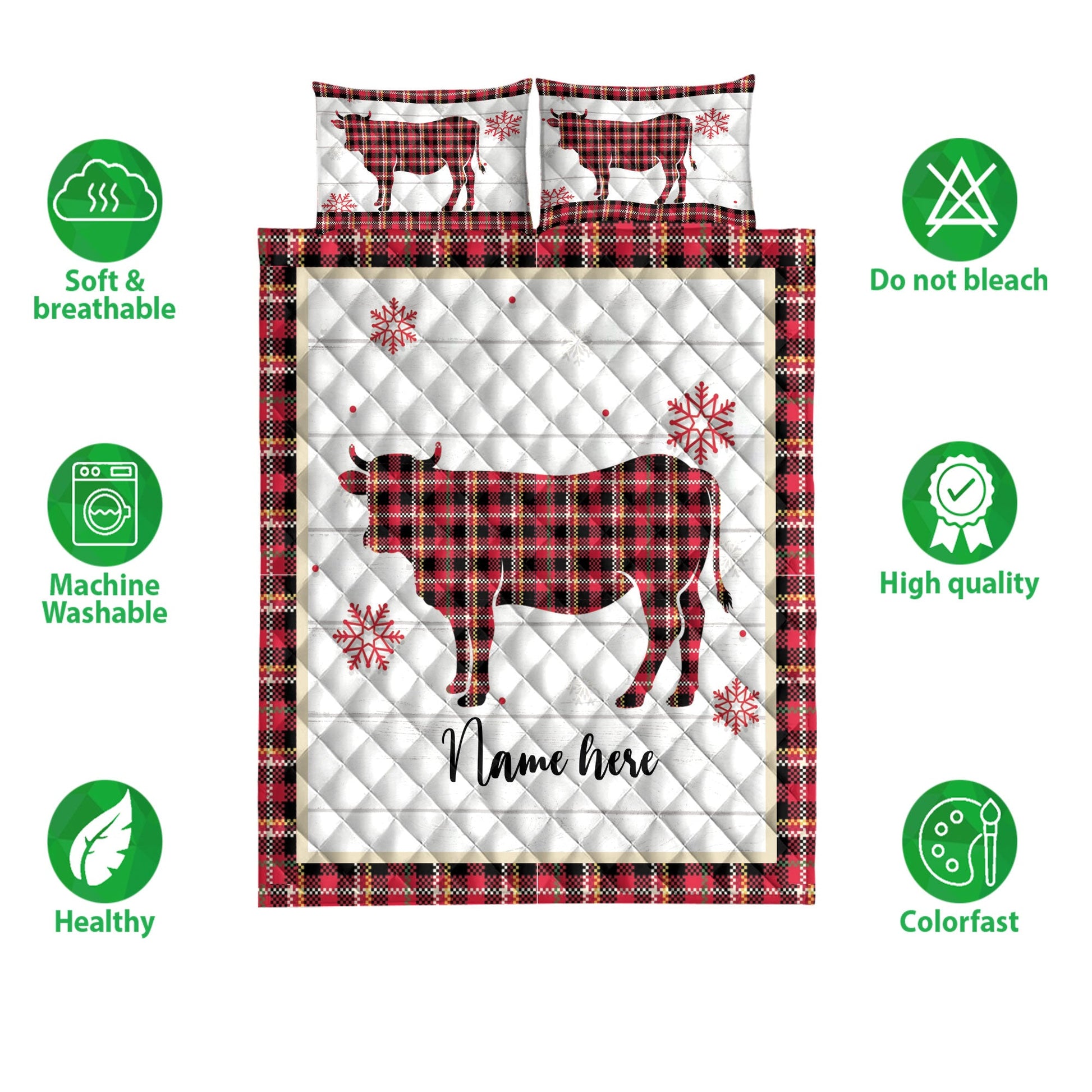 Personalized Cow Quilt Set, Christmas Cow Snowflake Red Plaid Quilt Blanket With Pillowcases, Custom Name Quilt Bedding Set, Christmas Gift