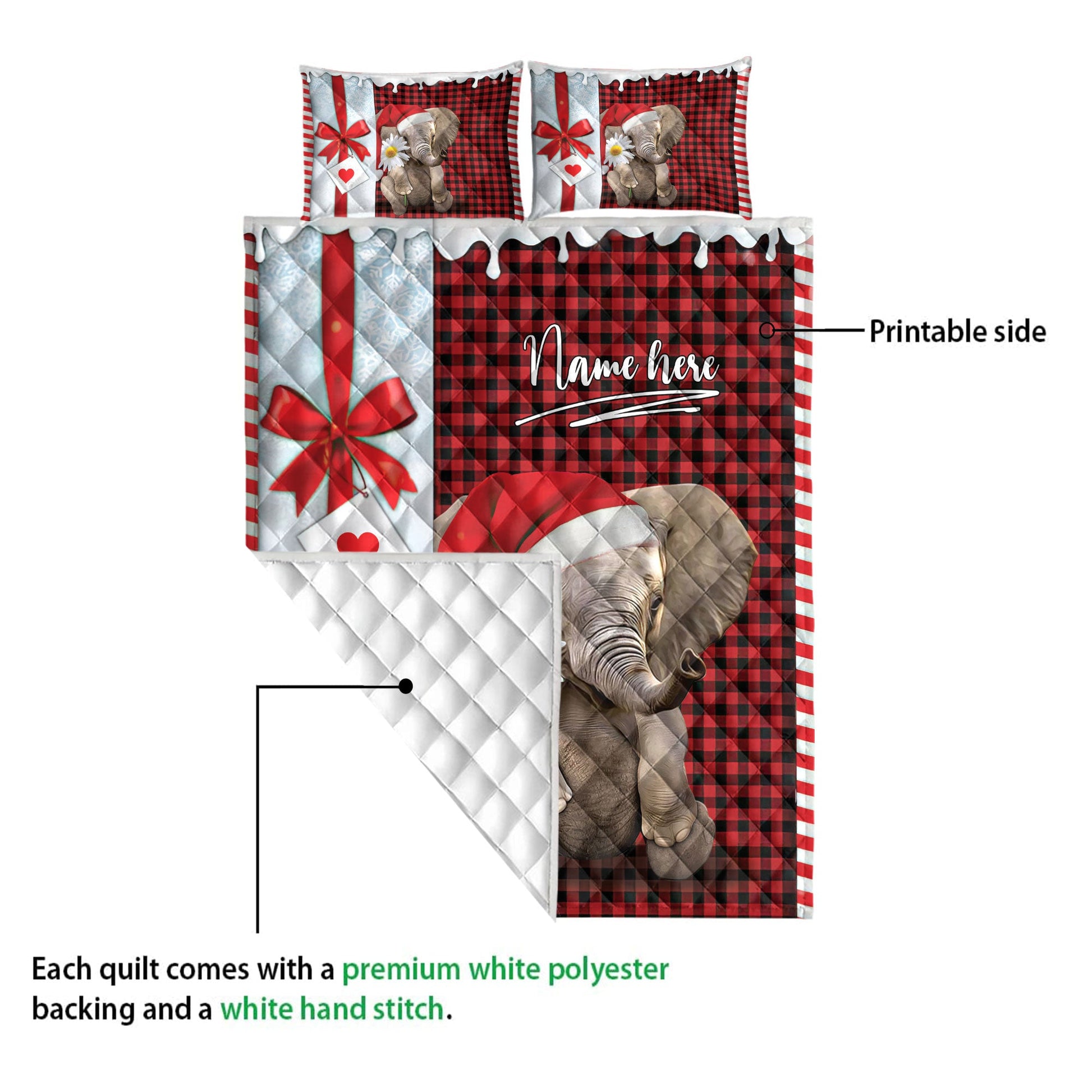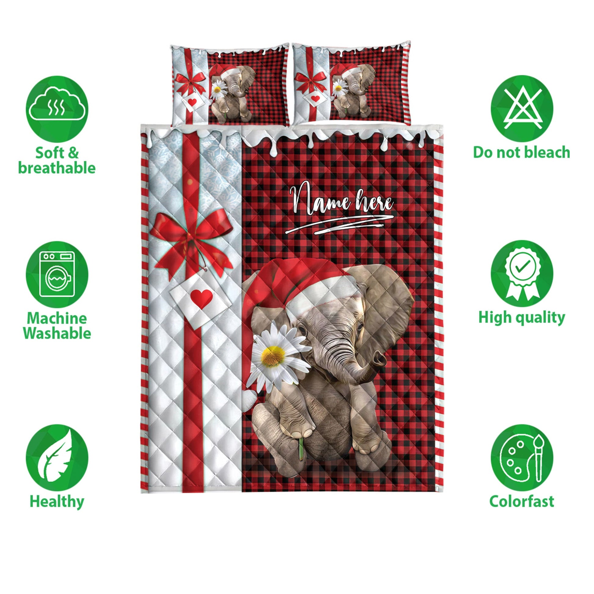Personalized Elephant Quilt Set, Elephant Santa Hat Withmas Letter Quilt Blanket With Pillowcases, Custom Name Quilt Bedding Set, Christmas Gift