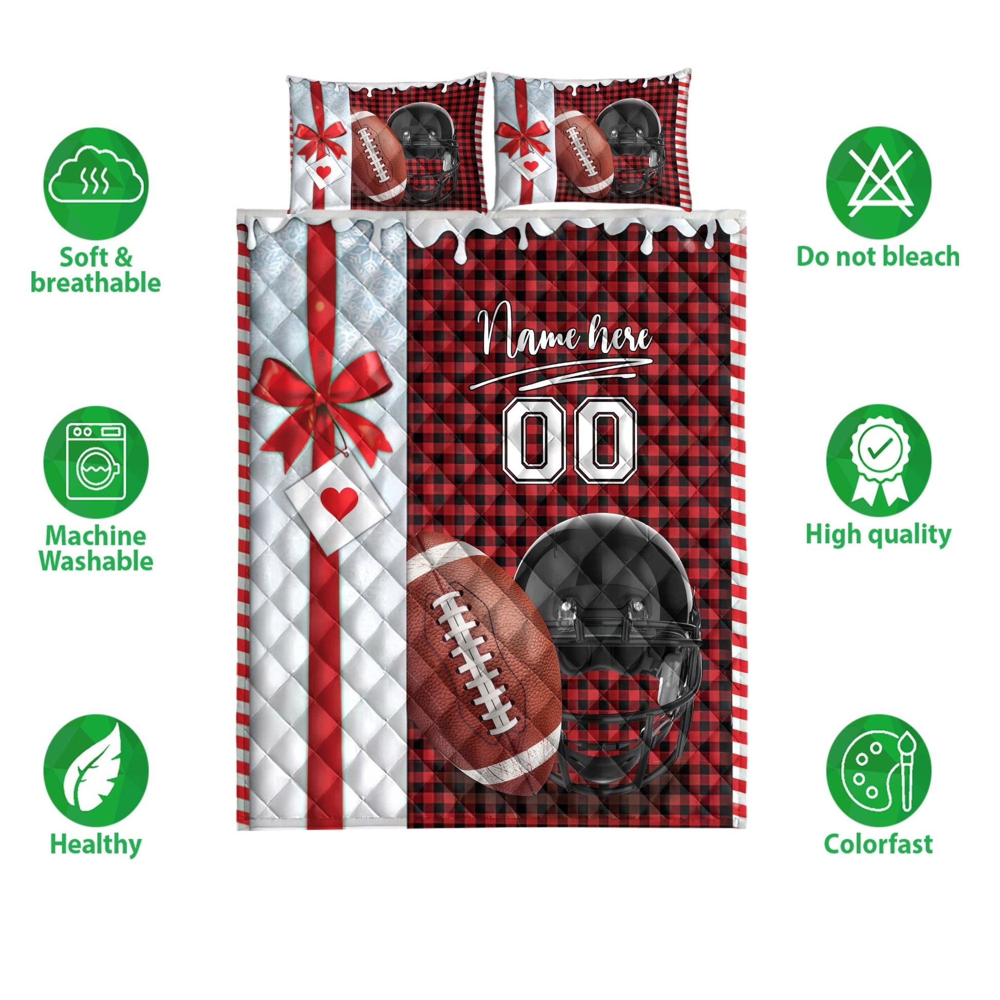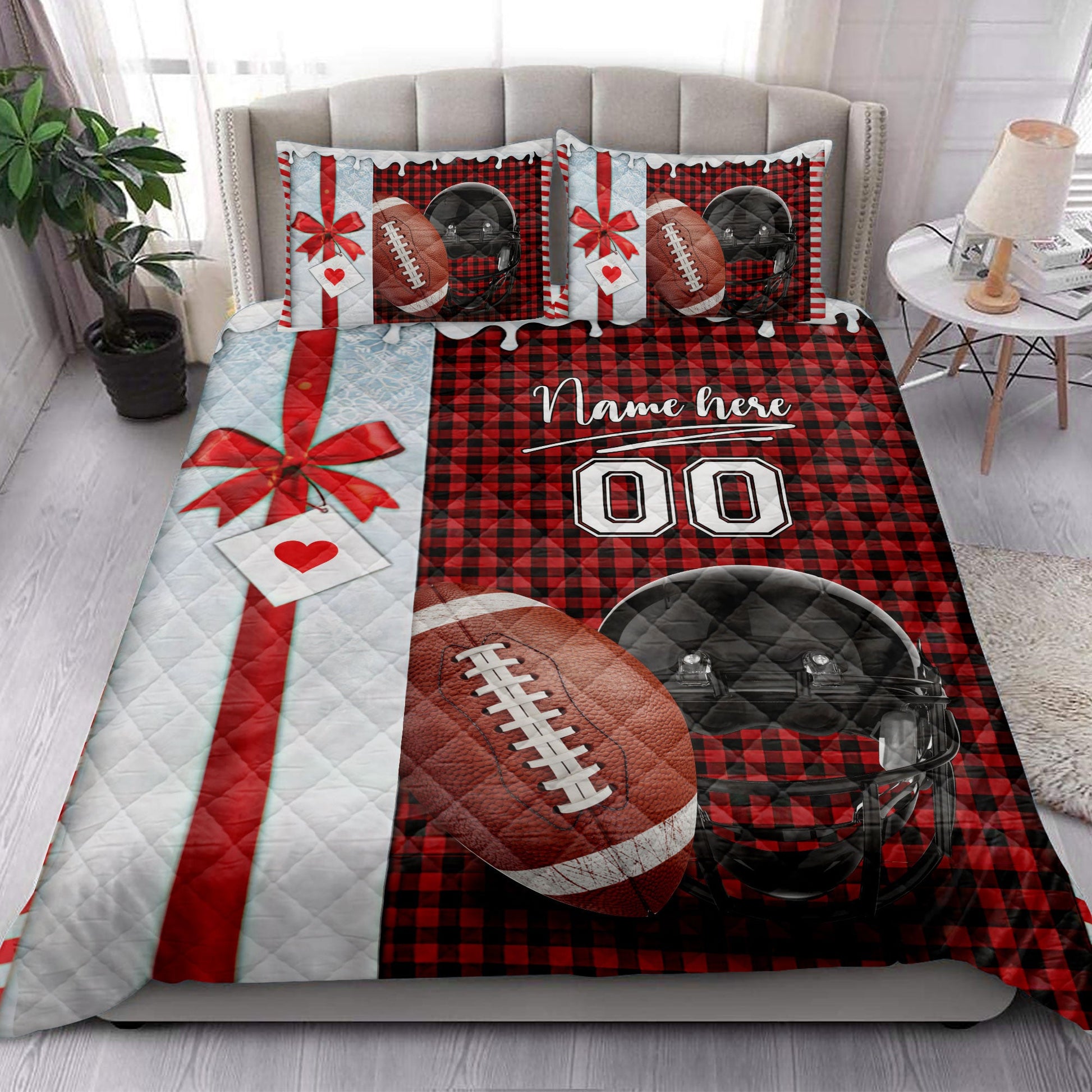 Personalized Football Quilt Set, Football Santa Hat Withmas Quilt Blanket With Pillowcases, Custom Name and Number Quilt Bedding Set, Christmas Gift