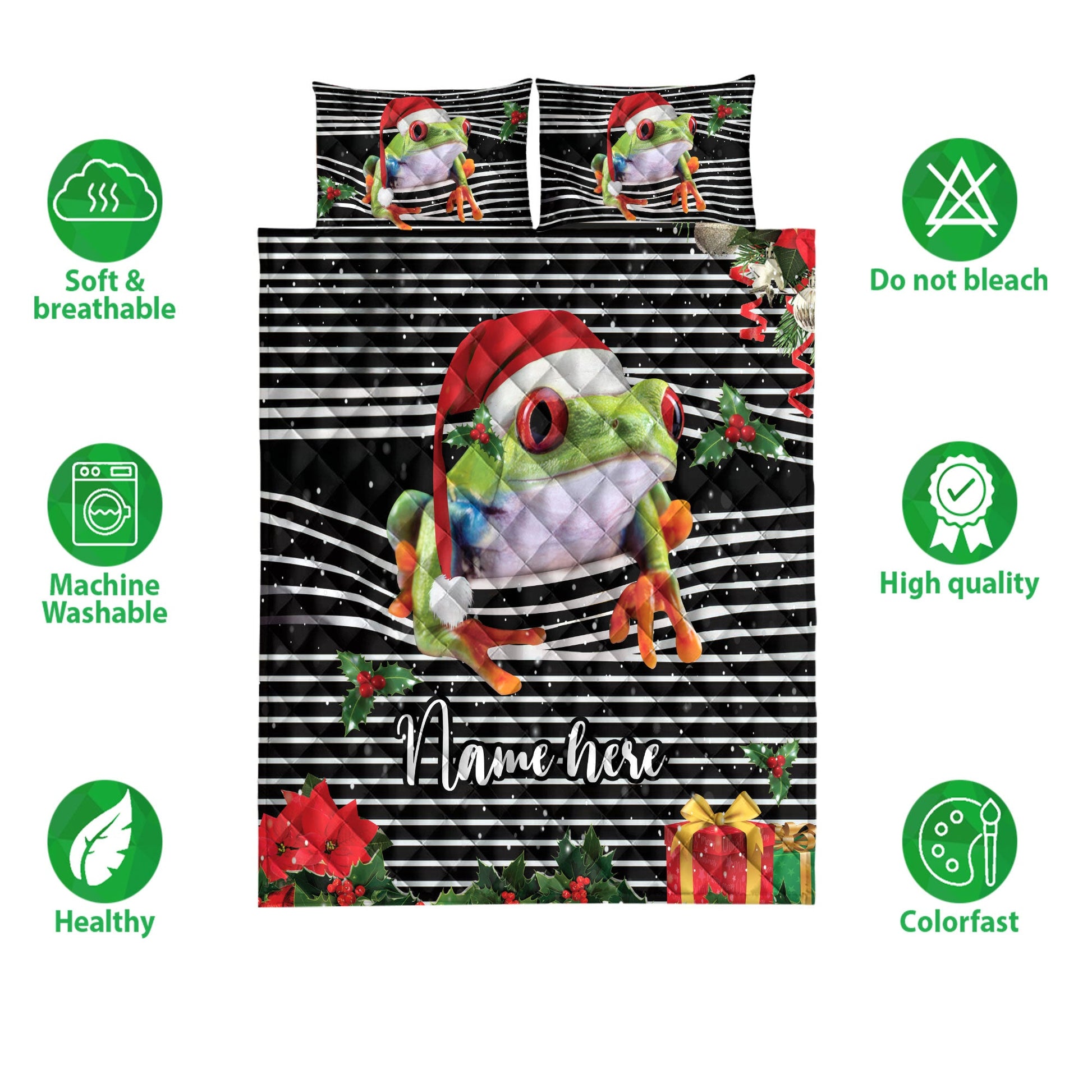Personalized Frog Quilt Set, Frogmas Striped With Santa Hat Quilt Blanket With Pillowcases, Custom Name Quilt Bedding Set, Christmas Gift