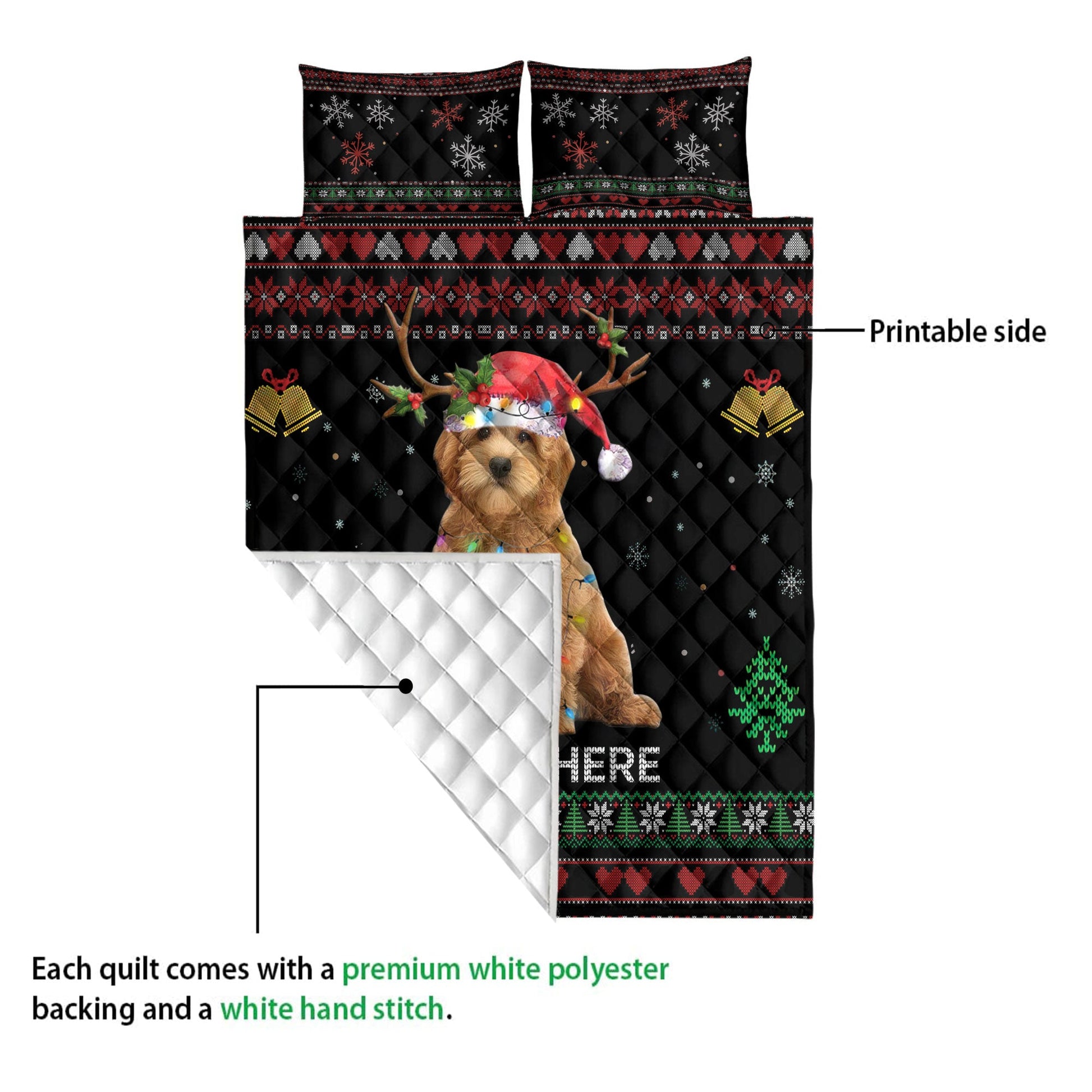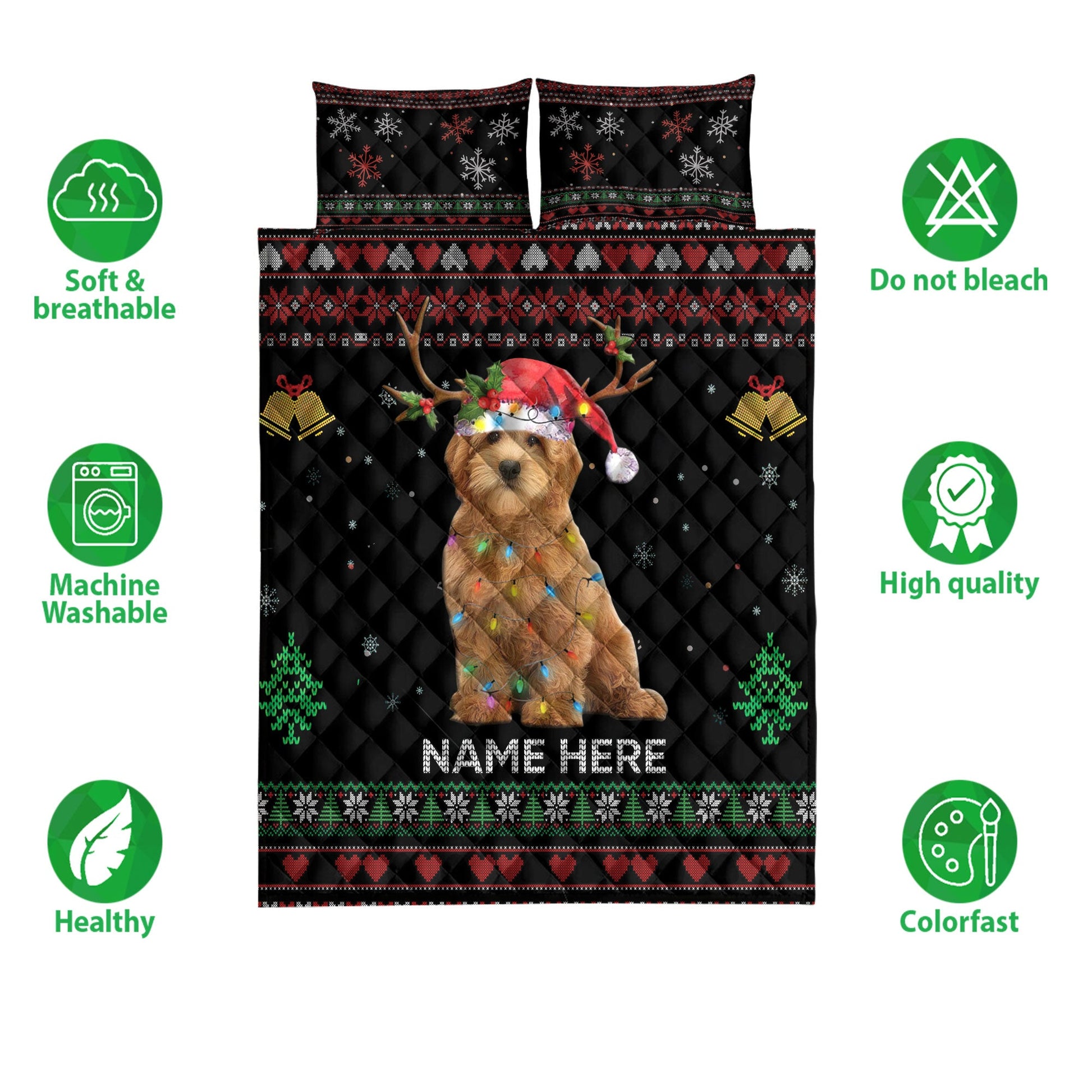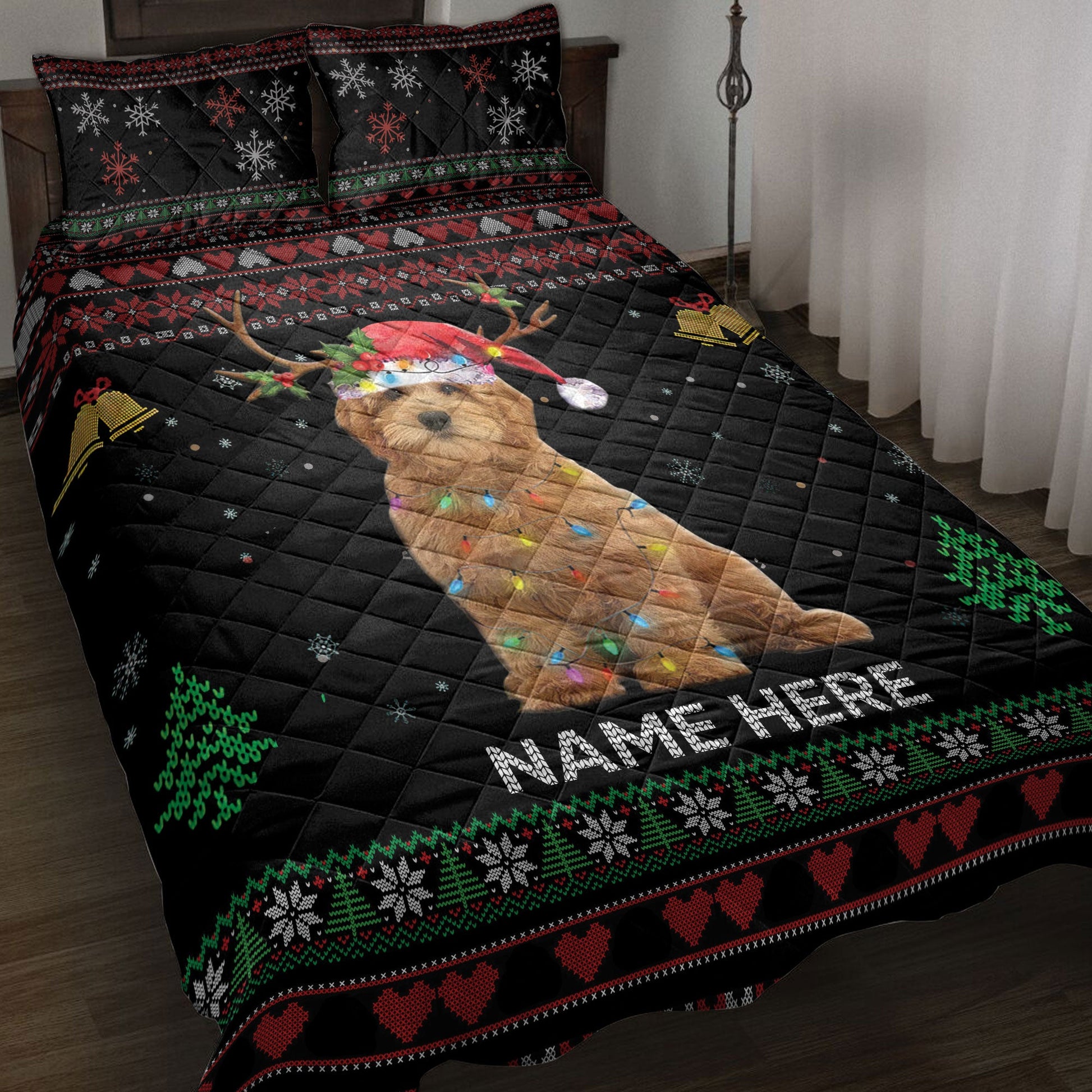 Personalized Goldendoodle Quilt Set, Goldendoodlemas Hat String Lights Quilt Blanket With Pillowcases, Custom Name Quilt Bedding Set, Christmas Gift