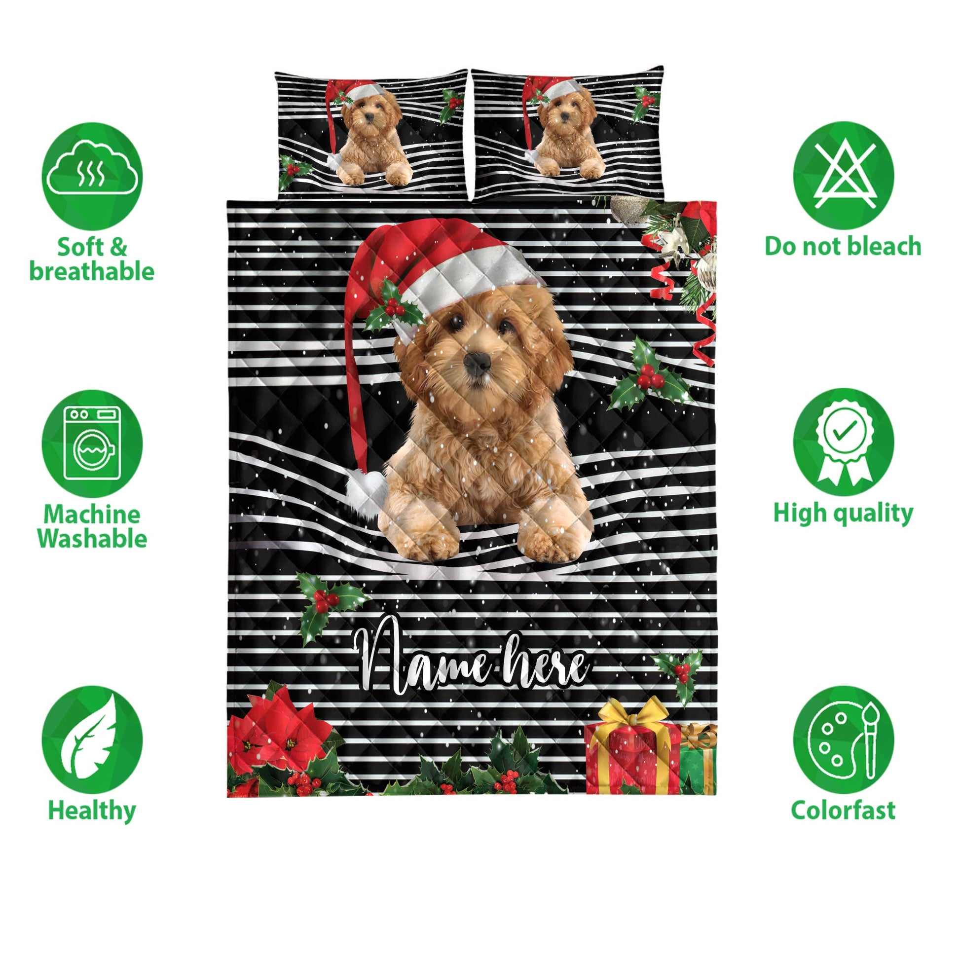 Personalized Goldendoodle Quilt Set, Goldendoodlemas Striped Santa Hat Quilt Blanket With Pillowcases, Custom Name Quilt Bedding Set, Christmas Gift