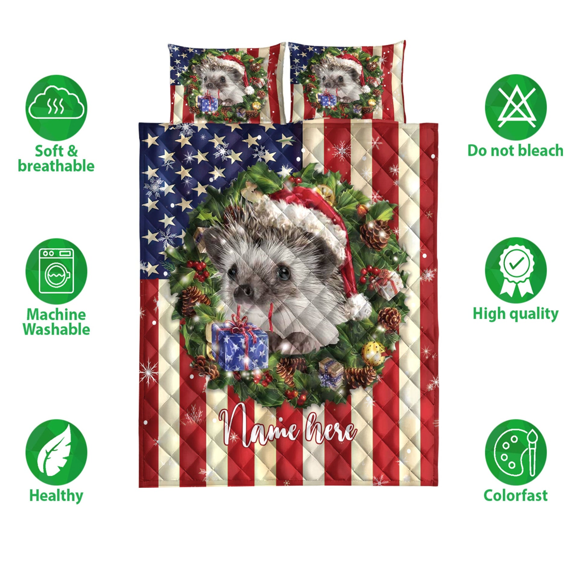 Personalized Hedgehog Quilt Set, Hedgehog Wearingmas Hat Wreath Quilt Blanket With Pillowcases, Custom Name Quilt Bedding Set, Christmas Gift