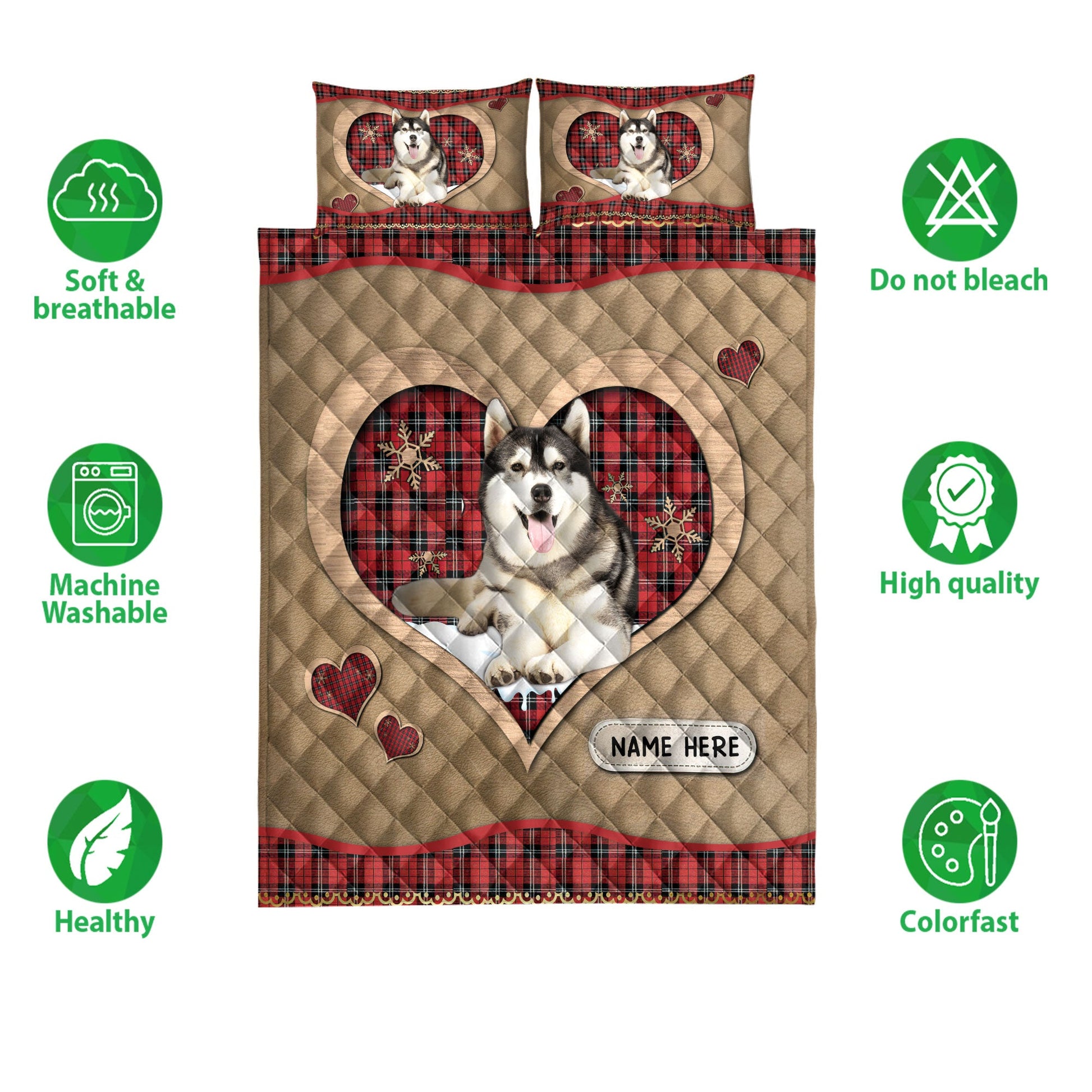 Personalized Husky Quilt Set, H Usky Sibirmas Heart Red Plaid Quilt Blanket With Pillowcases, Custom Name Quilt Bedding Set, Christmas Gift