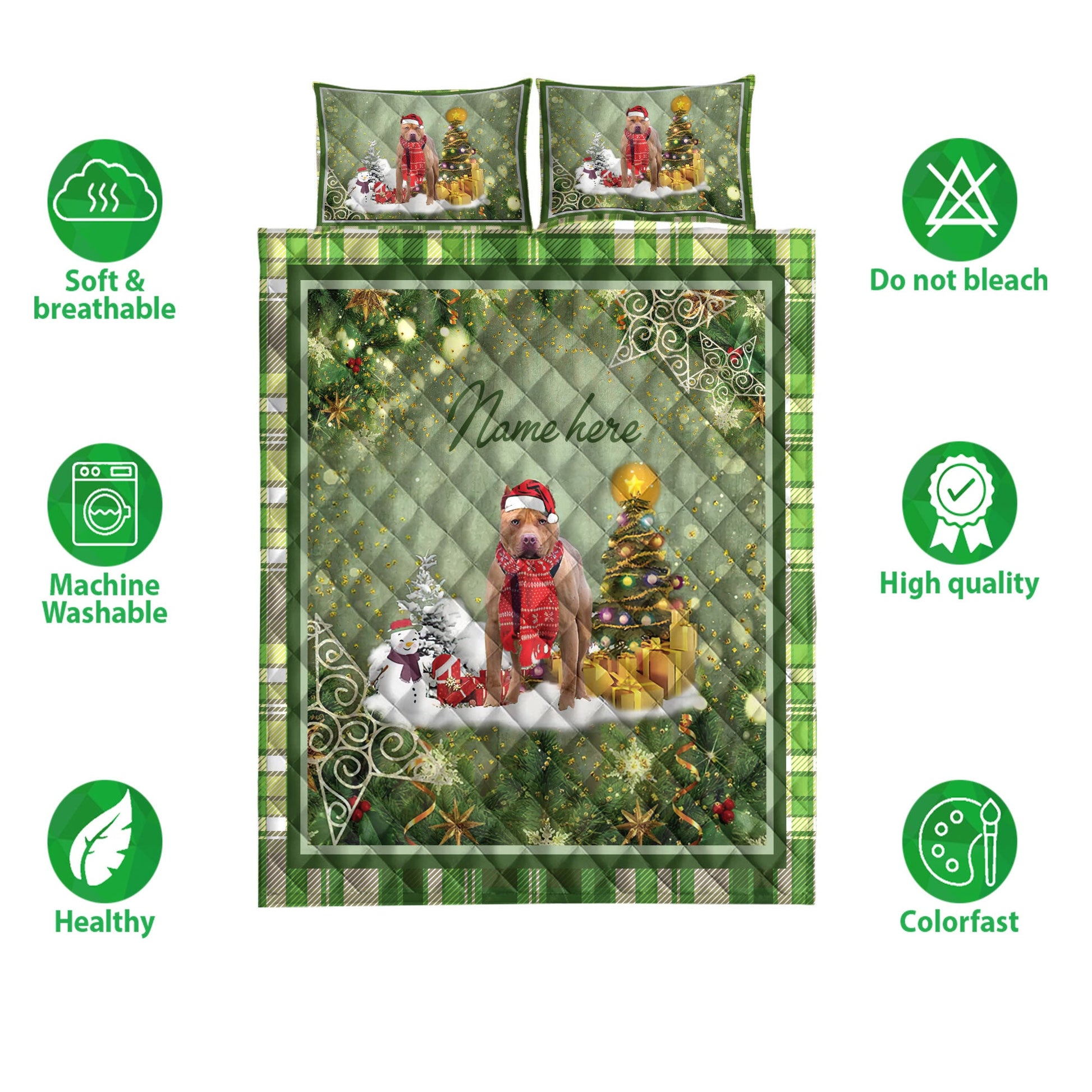 Personalized Pitbull Quilt Set, Pitbullmas Tree String Lights Quilt Blanket With Pillowcases, Custom Name Quilt Bedding Set, Christmas Gift