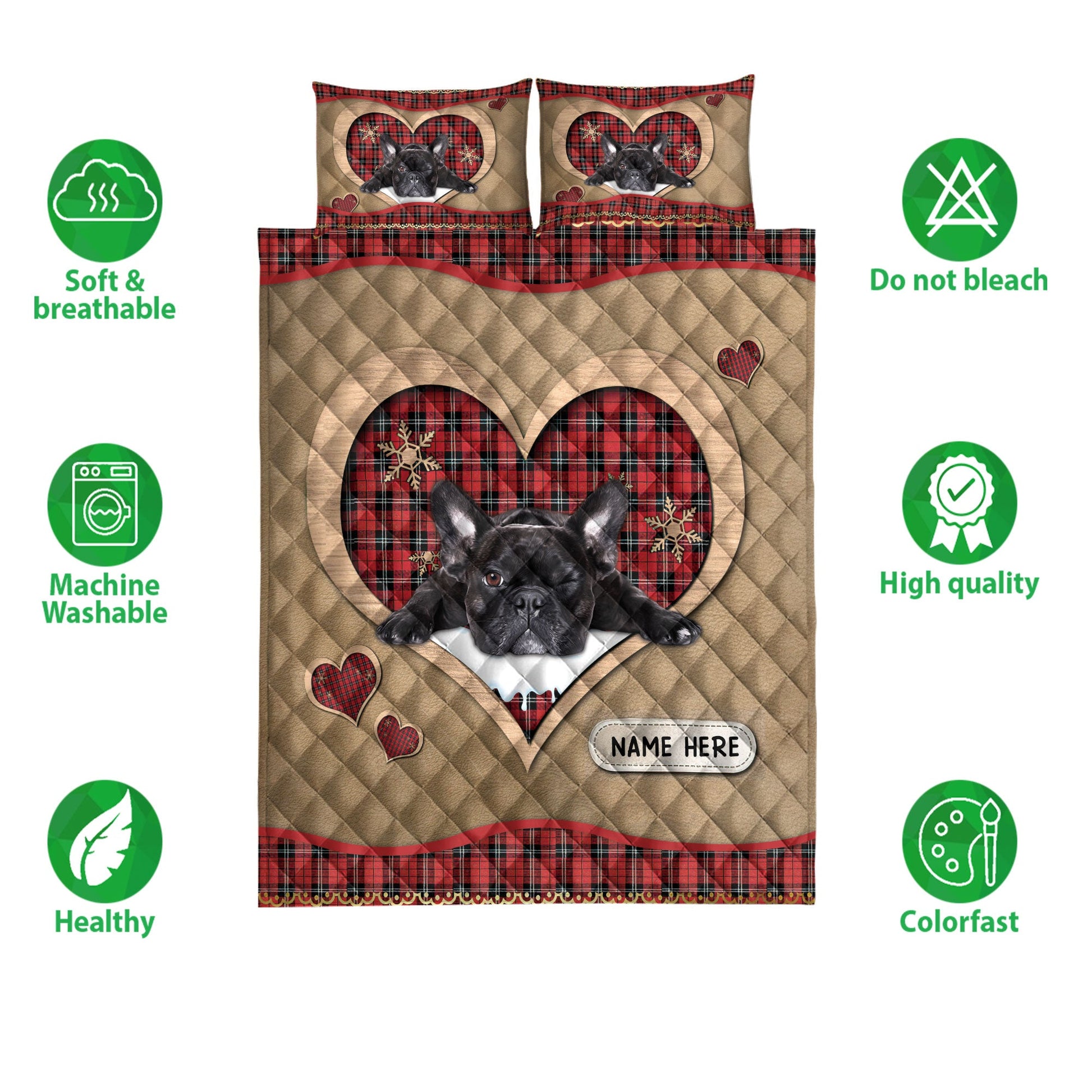Personalized Pug Quilt Set, Black Pugmas Heart Red Plaid Quilt Blanket With Pillowcases, Custom Name Quilt Bedding Set, Christmas Gift