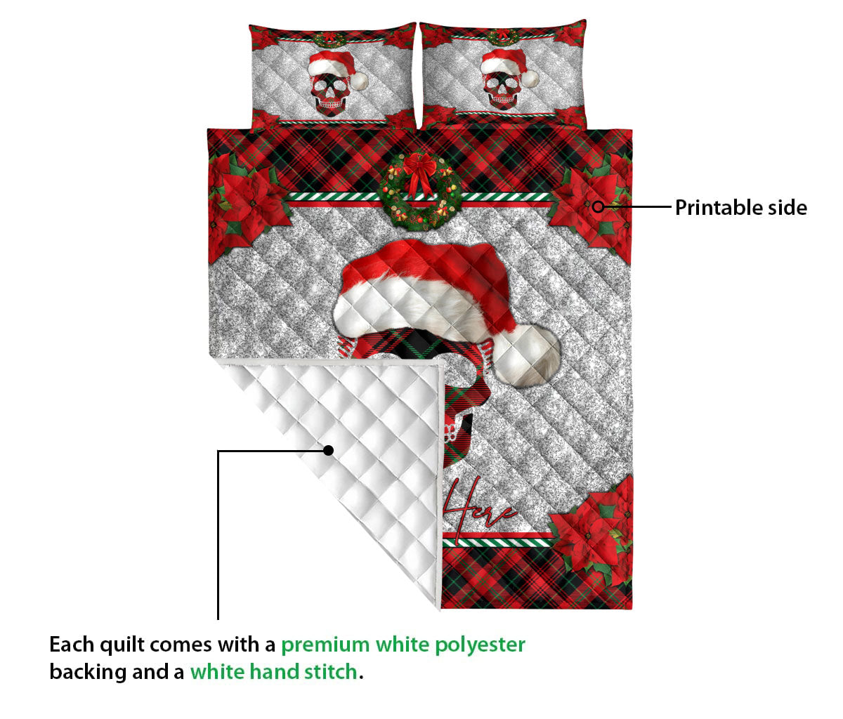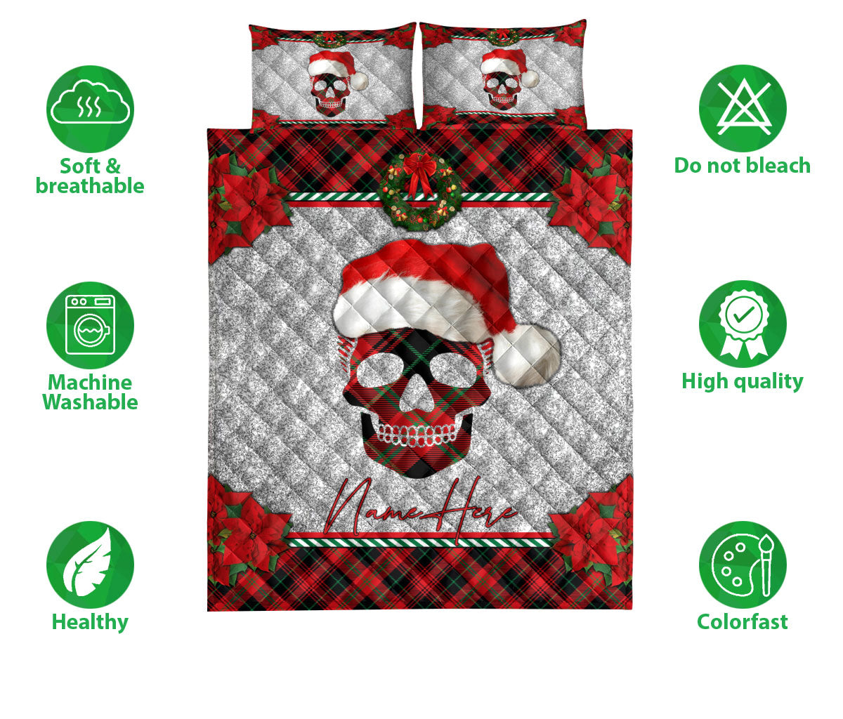 Personalized Skull Quilt Set, Skull With Santa Hat Red Plaid Quilt Blanket With Pillowcases, Custom Name Quilt Bedding Set, Christmas Gift