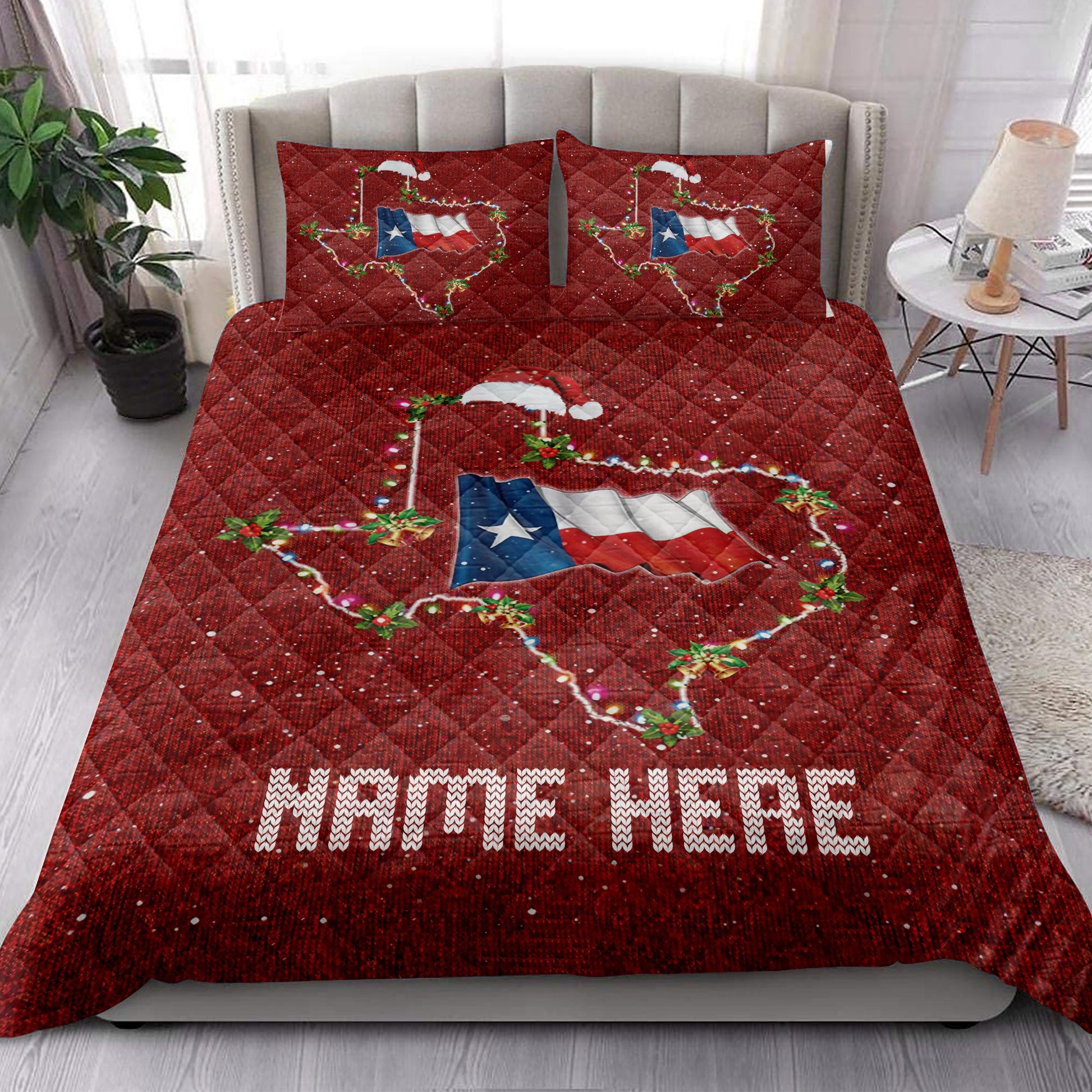 Personalized Texas Flag Quilt Set, Texasmas Hat String Lights Western Quilt Blanket With Pillowcases, Custom Name Quilt Bedding Set, Christmas Gift