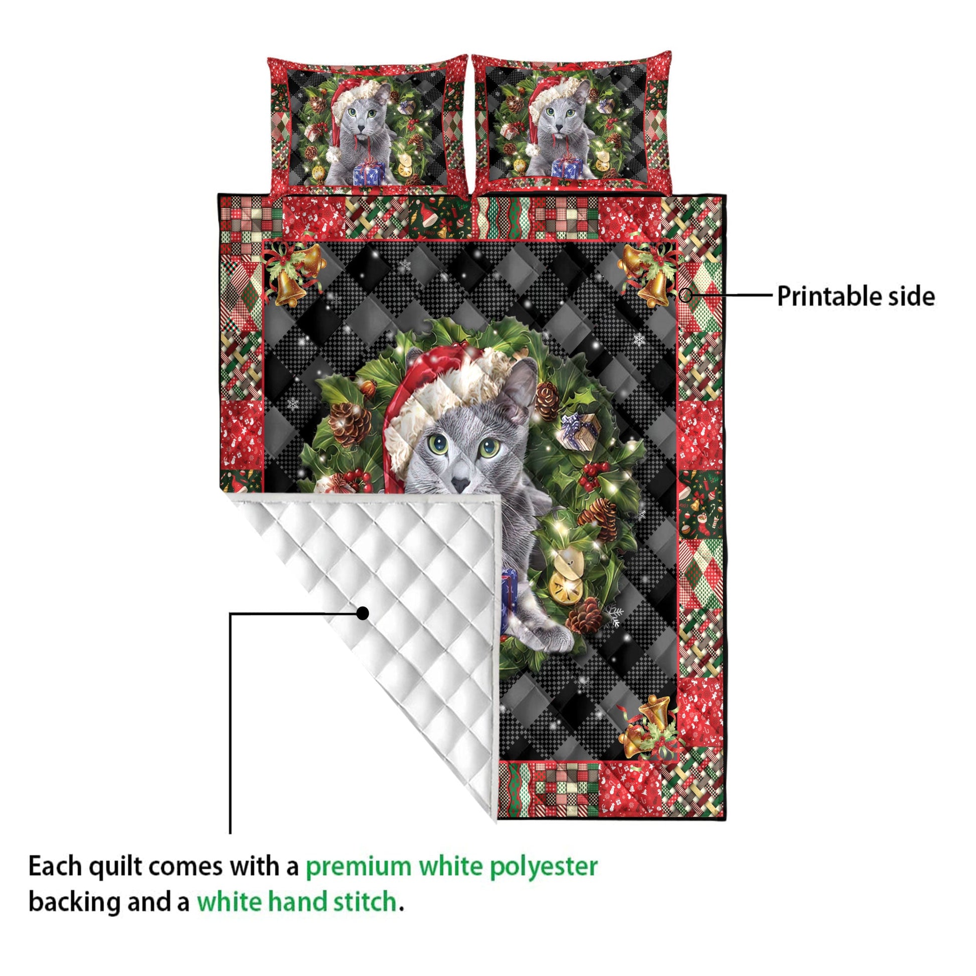 Russian Blue Quilt Set, R Ussian Blue Wearingmas Hat Wreath Cat Quilt Blanket With Pillowcases, Quilt Bedding Set, Christmas Gift