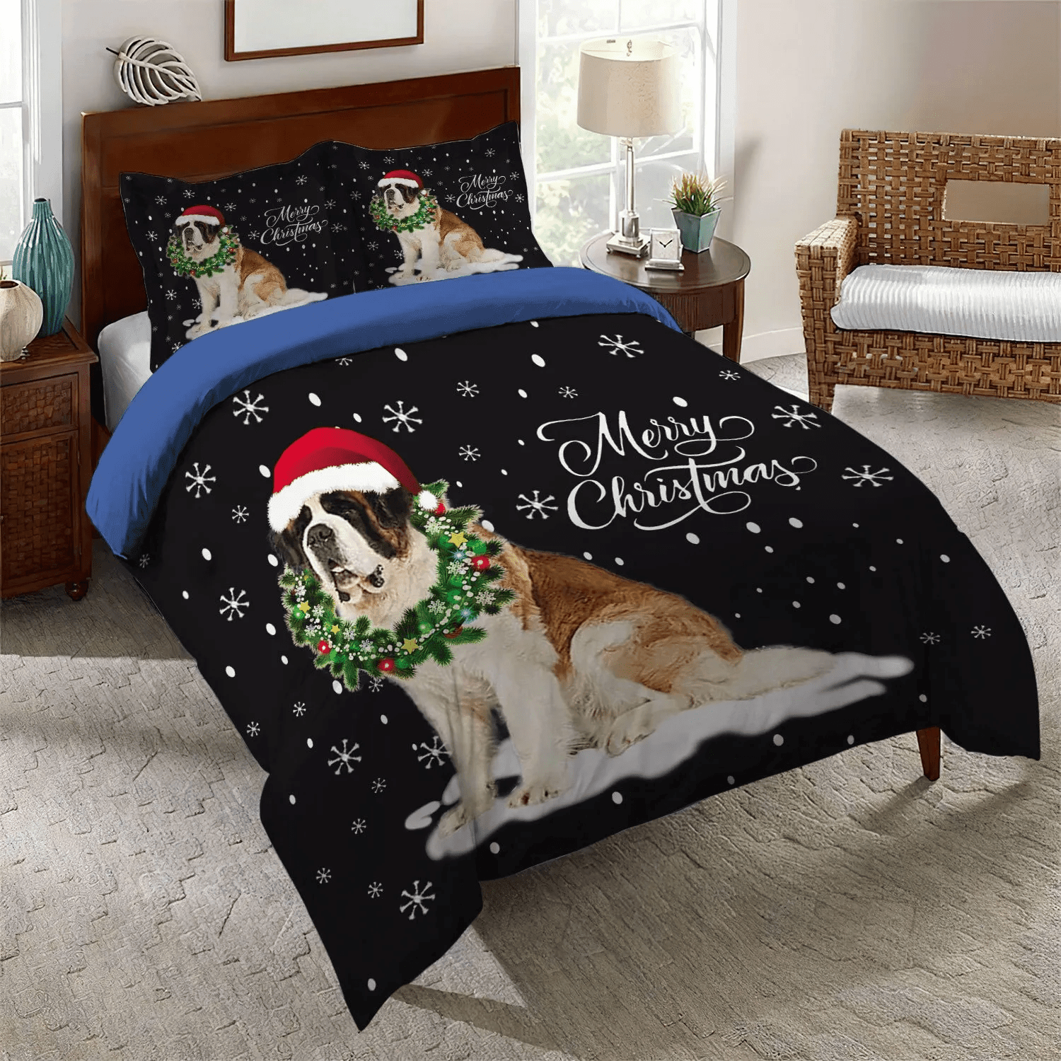 St Bernard King Size Bedding Set, Christmas Soft Duvet Cover Set, St. Bernard Dog Wreath Necklace Christmas Bedding Set, Gifts for Dog