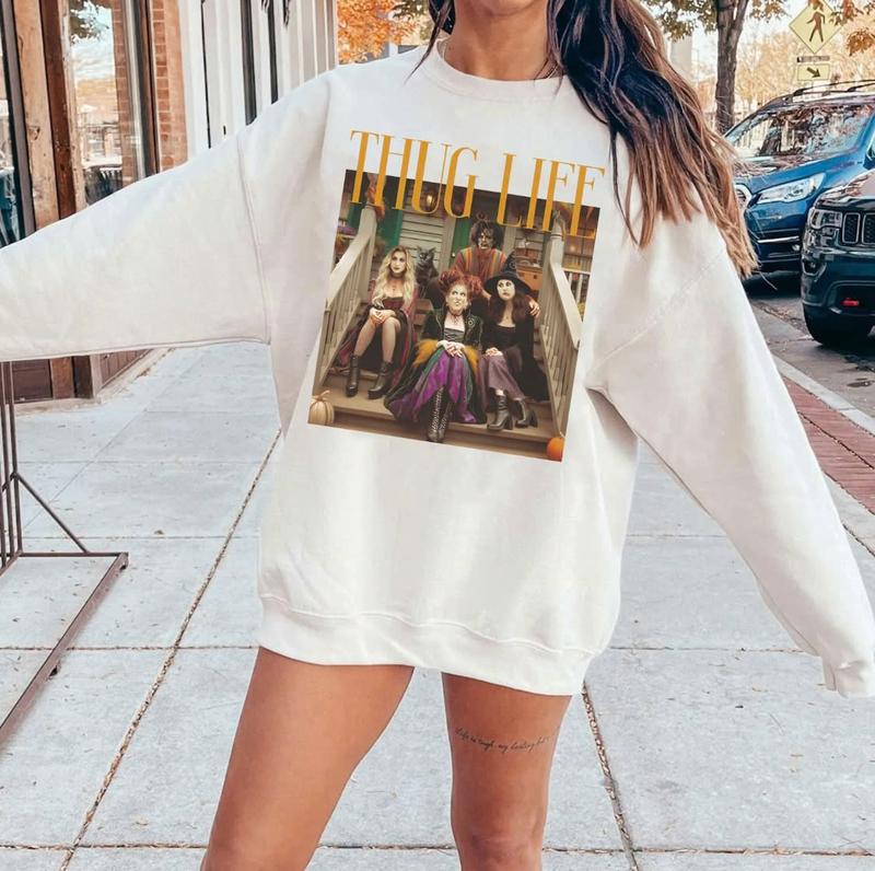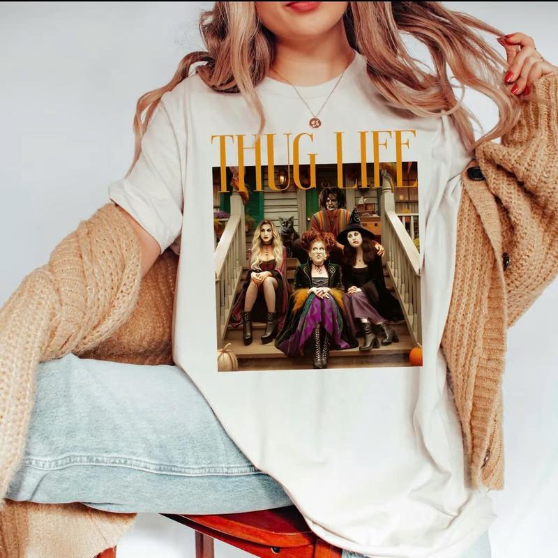 Thug Life Halloween Bad W1tches Shirt, Retro Halloween Character Shirt, Halloween S4nderson Sisters Gift Casual Cotton Fabric Sleeve Top Womenswear