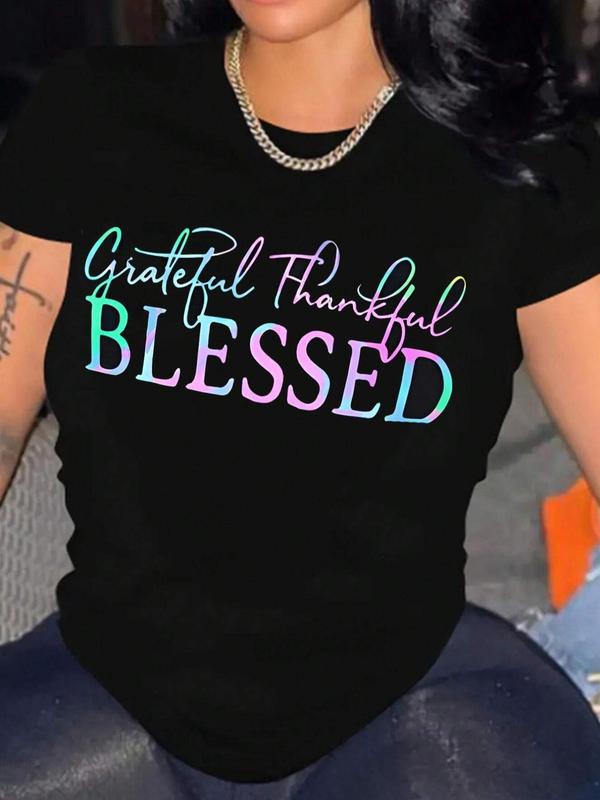 Women's Letter Print Round Neck Short Sleeve Tee, Fashion Casual Crew Neck T-Shirt for Daily Holiday Vacation Outdoor Wear, Ladies Clothes for All Sea